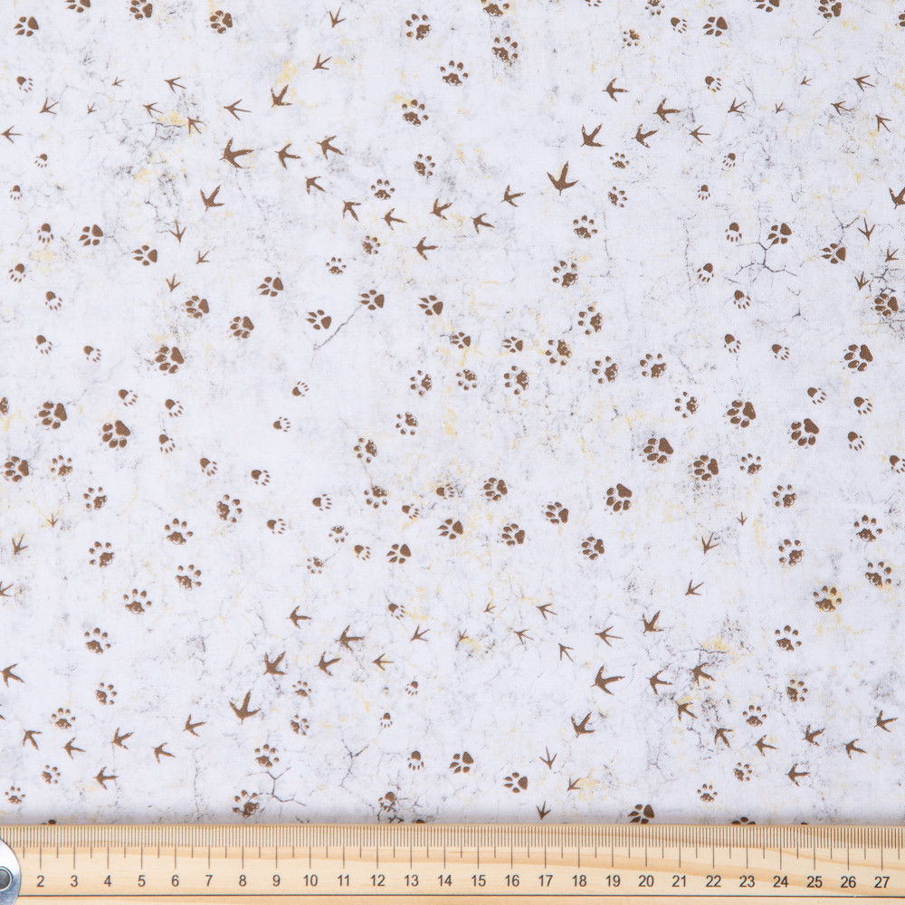 Creature footsteps crisscross this white background. Beautiful, high quality, printed cotton fabric. Ideal for quilting, masks, crafts, displays, table decoration and as a dressmaking fabric.