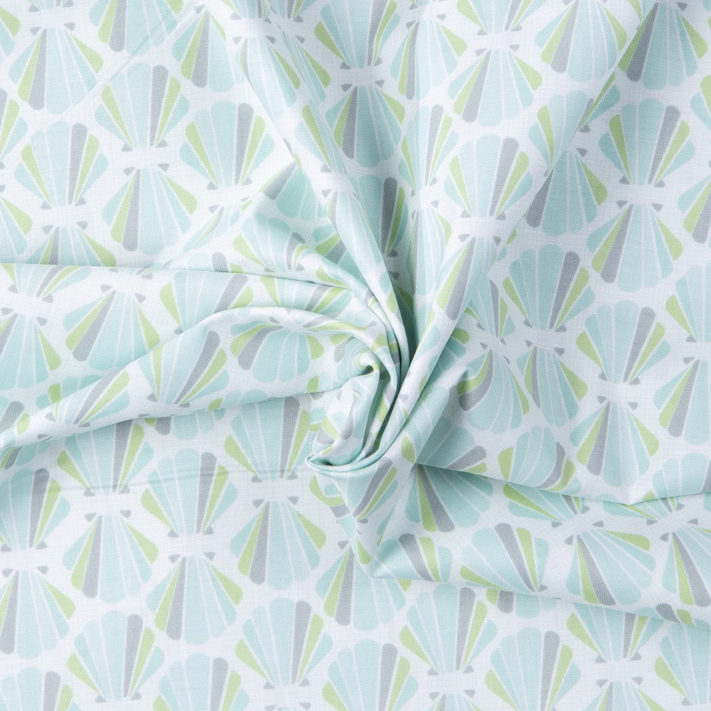 Seaside theme print on a white background. Beautiful, high quality, printed cotton fabric. Ideal for quilting, masks, crafts, displays, table decoration and as a dressmaking fabric.