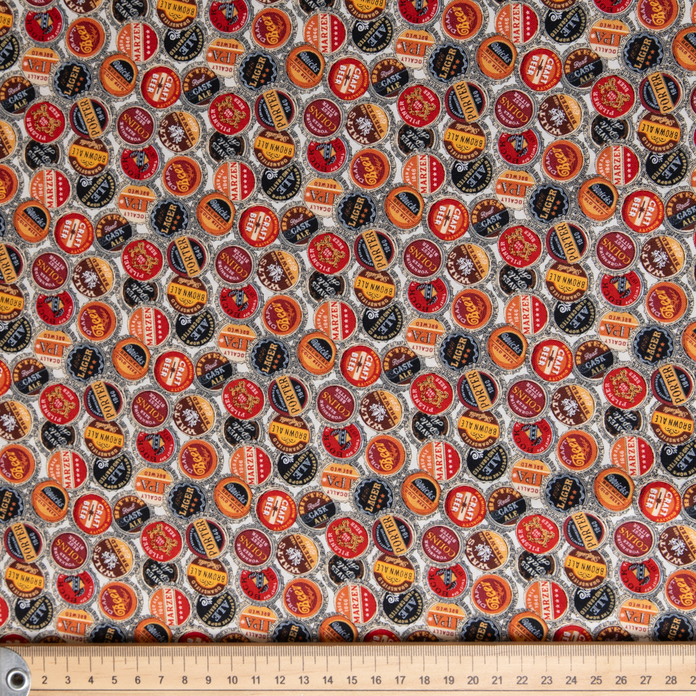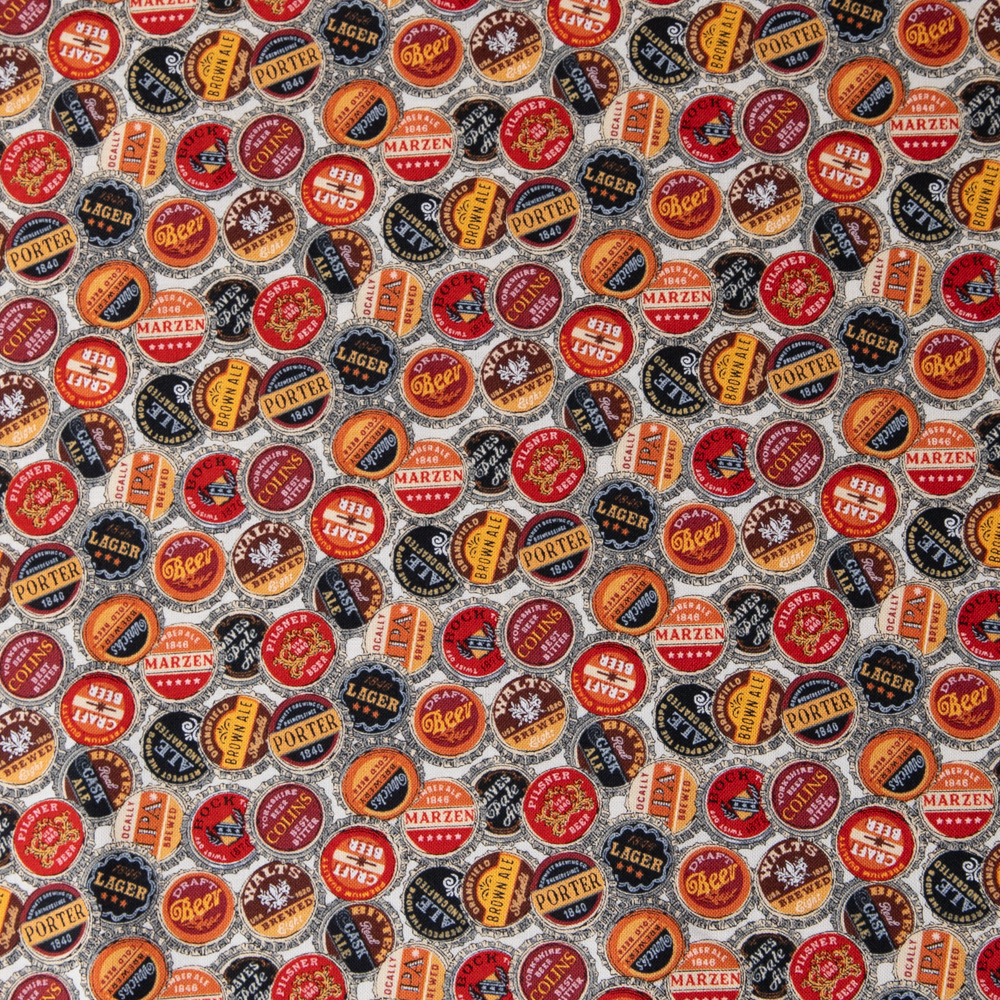 Beer bottle caps of all kinds make up this allover pattern. Beautiful, high quality, printed cotton fabric. Ideal for quilting, masks, crafts, displays, table decoration and as a dressmaking fabric.