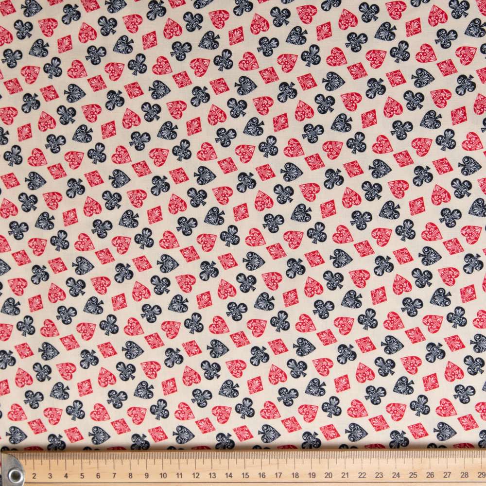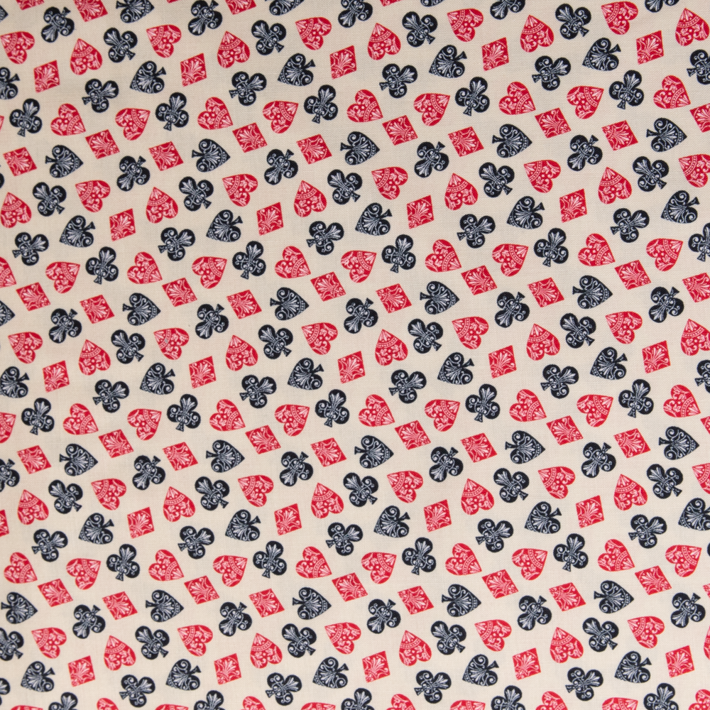 Hearts, spades, diamonds and clubs with a damask pattern adorn this neutral background. Beautiful, high quality, printed cotton fabric. Ideal for quilting, masks, crafts, displays, table decoration and as a dressmaking fabric.
