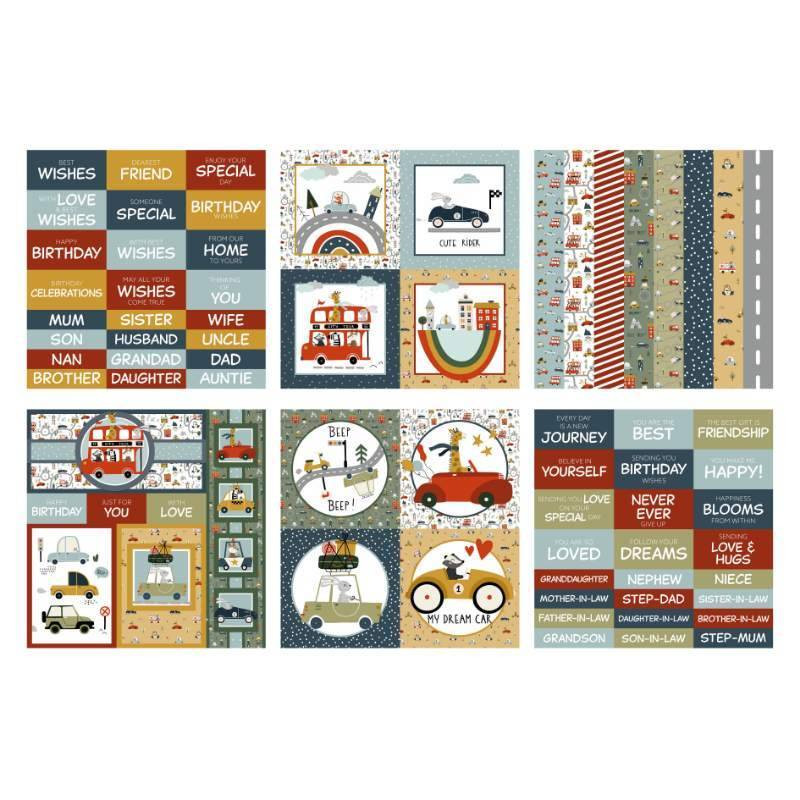 This 8" x 8" Embellishment Pad is part of the Road Trip Collection from The Paper Boutique and Creative Expressions. This paper pad includes 30 single sided sheets of paper in six designs. You get five sheets of each design. These designs include decorative papers, square and round circle toppers, sentiments, and name titles. These designs are printed on 150 gsm paper which is lightweight paper. This paper can be used for cards, scrapbook pages, tags, and other paper crafting projects.