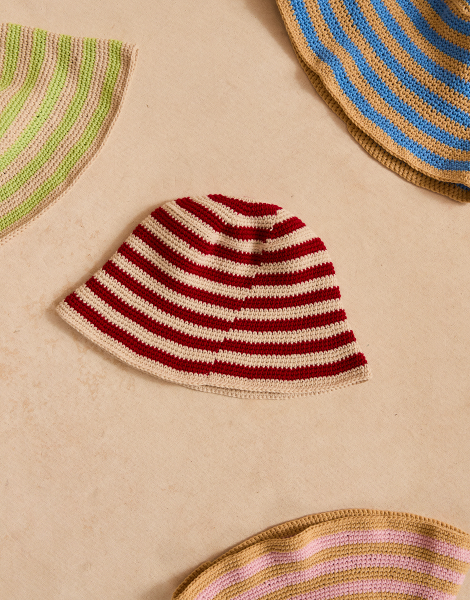 Using just two balls, crochet the Throw Some Shade Bucket Hat- a summer essential! Work the stitches in double crochet and alternate shades for a stripey result.