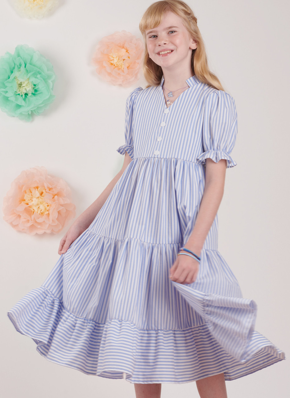 Tiered dress with decorative button front includes ruffled collar and side seam pockets. Dress comes in two length options and three sleeve variations. Back of dress has an invisible zipper.