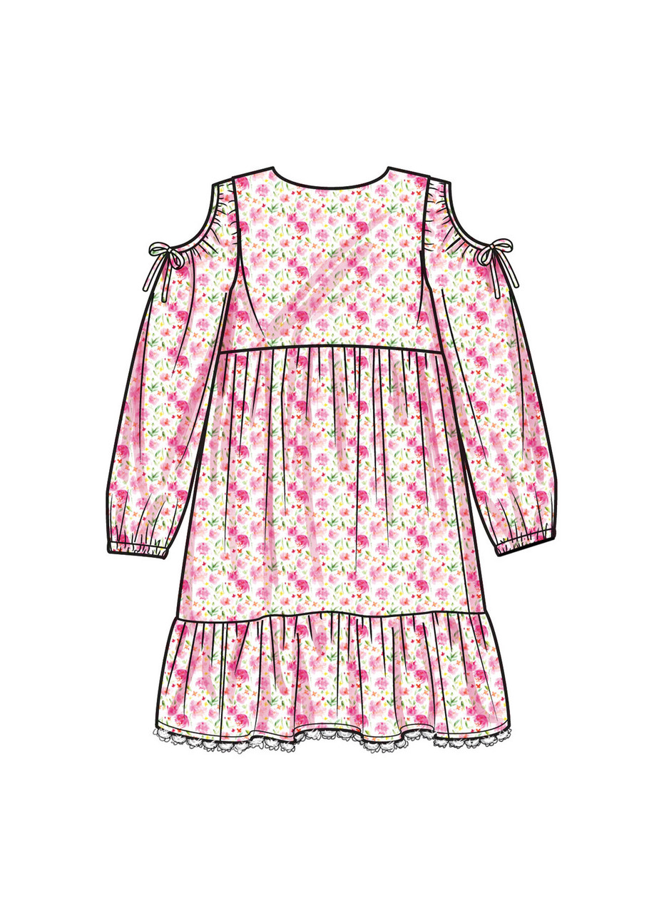 Relaxed fit tiered dress for children and girls sized 3 to 14 has lace trim, invisible zipper closure and sleeve variations. Views A and B have shoulder cutout with bow detail. View C dress has long puffed and gathered sleeves. View D is a sleeveless dress.