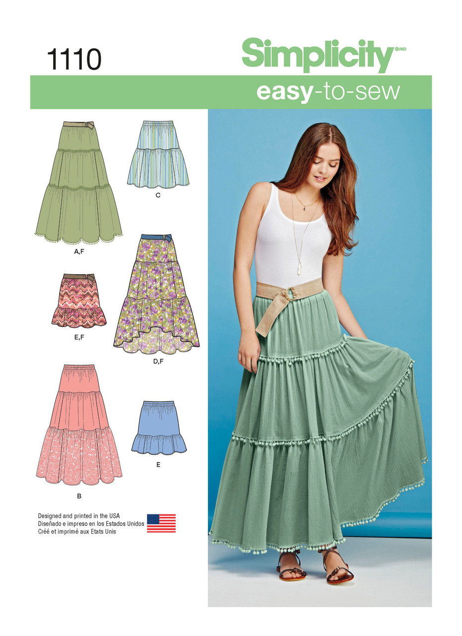This Easy-to-Sew skirt for women can feature three tiers with yarn pom trim, lace overlay, or high low hemline, or two tiers in knee length or mini. Pattern also includes belt. Simplicity sewing pattern.