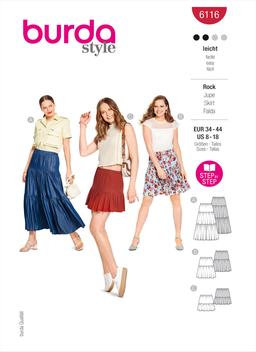 Pretty tiered skirts are easy to sew with with an elastic waist. Skirts like these, slim fitting at the hips and wider toward the hem, are always an option. Go for a long skirt in an elegant fabric for evening wear or choose the shorter style to team with a lightweight top for leisurewear. Sew yourself a new favorite skirt!