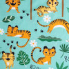 Part of the Tiger Tails collection. Orange allover jungle creatures on blue. Beautiful, high quality, printed cotton fabric. Ideal for quilting, masks, crafts, displays, table decoration and as a dressmaking fabric.