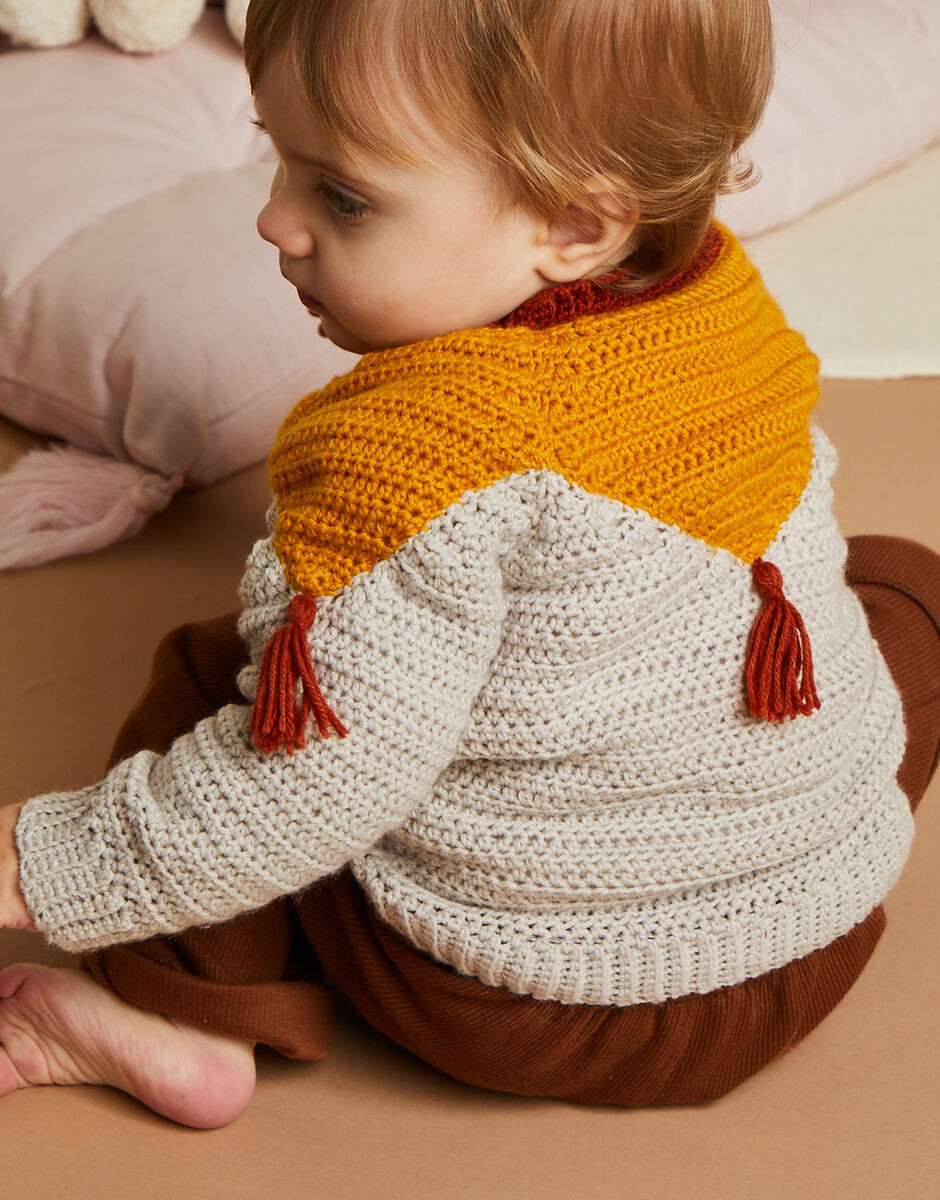 Crochet this cute raglan sleeve sweater with crochet rib on the hem and cuffs. Add the finishing touch by creating four small tassels and sewing them on.