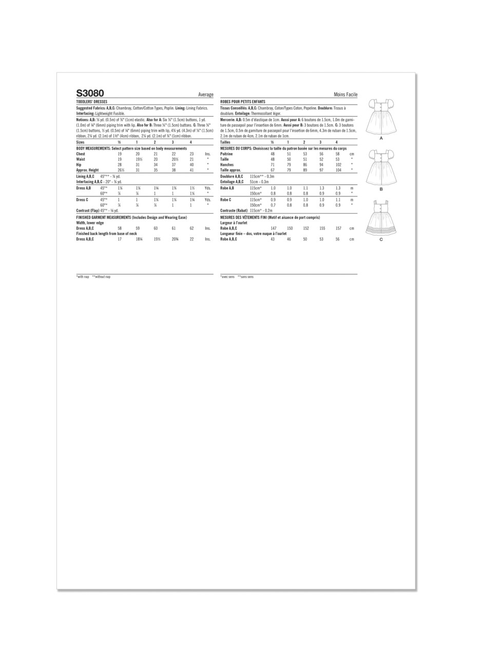 Adorable toddlers’ dress sewing patterns with puff sleeves or straps have lined bodice, gathered waist, front patch pockets and back button closure. View A has purchase piping at the collar and pockets. View C has contrast collar with purchased piping and ribbon trim on the straps, pockets and above the hem.