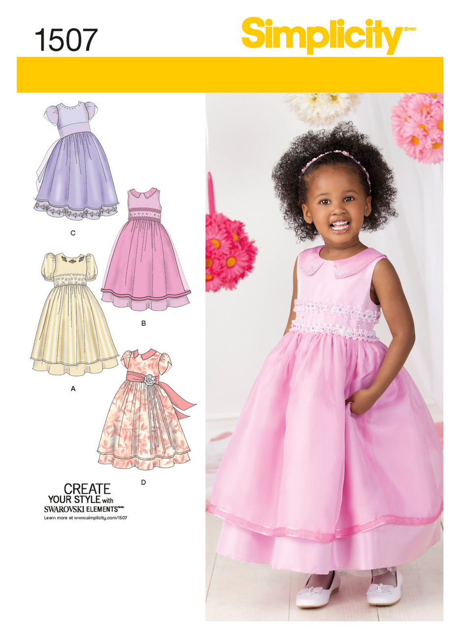 Toddlers' & Child's dress can be made with a variety of sleeves. Change it up with contrasting collar, sleeves and sheer overskirt. Have fun with different trims and Create Your Style with Swarvoski Elements™.