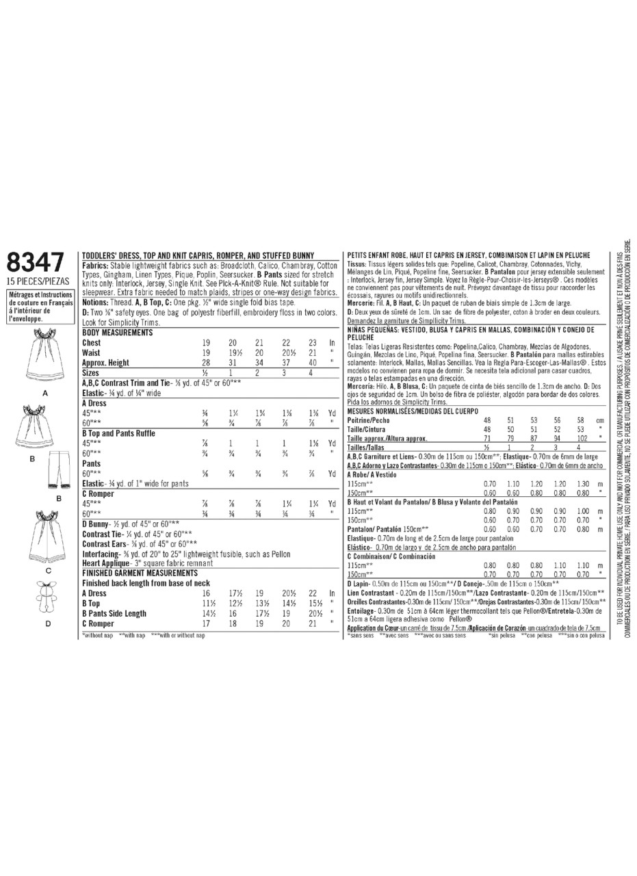 Create these toddler outfits plus an adorable stuffed bunny. Pattern includes toddlers' dress, top, knit capris, romper and stuffed bunny. The dress, top and romper are sleeveless and have ruffle neckline with bow. Capris have ruffle detail at the ankle and are sized for stretch knits only.