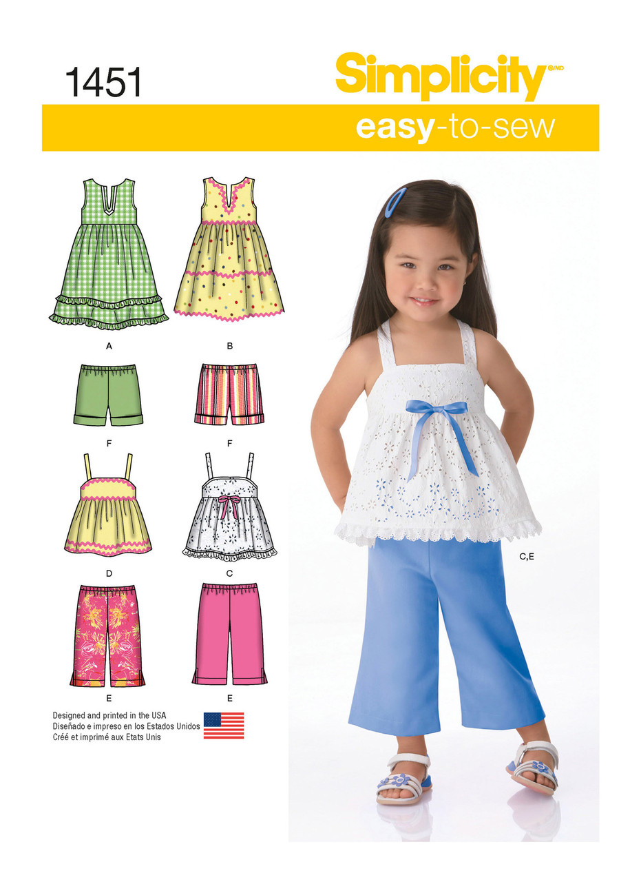 Toddlers' Easy to Sew dresses, top, cropped trousers and shorts make a complete summer wardrobe for your toddler. Dresses and top can be made with trims or ruffles. Shorts and trousers have elastic waistband.