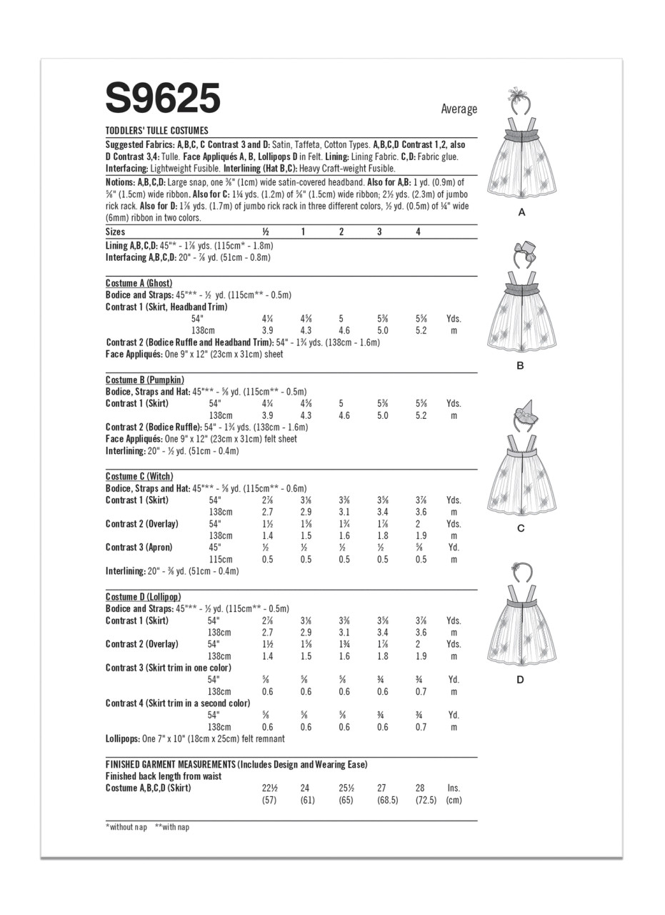 Jumper or sundress style calf length costume dress has bodice with wide shoulder straps, back snap closure and multiple tulle skirts with lining for comfort. Embellished headbands, appliques and trims create pumpkin, ghost, witch or lollipop-themed characters.