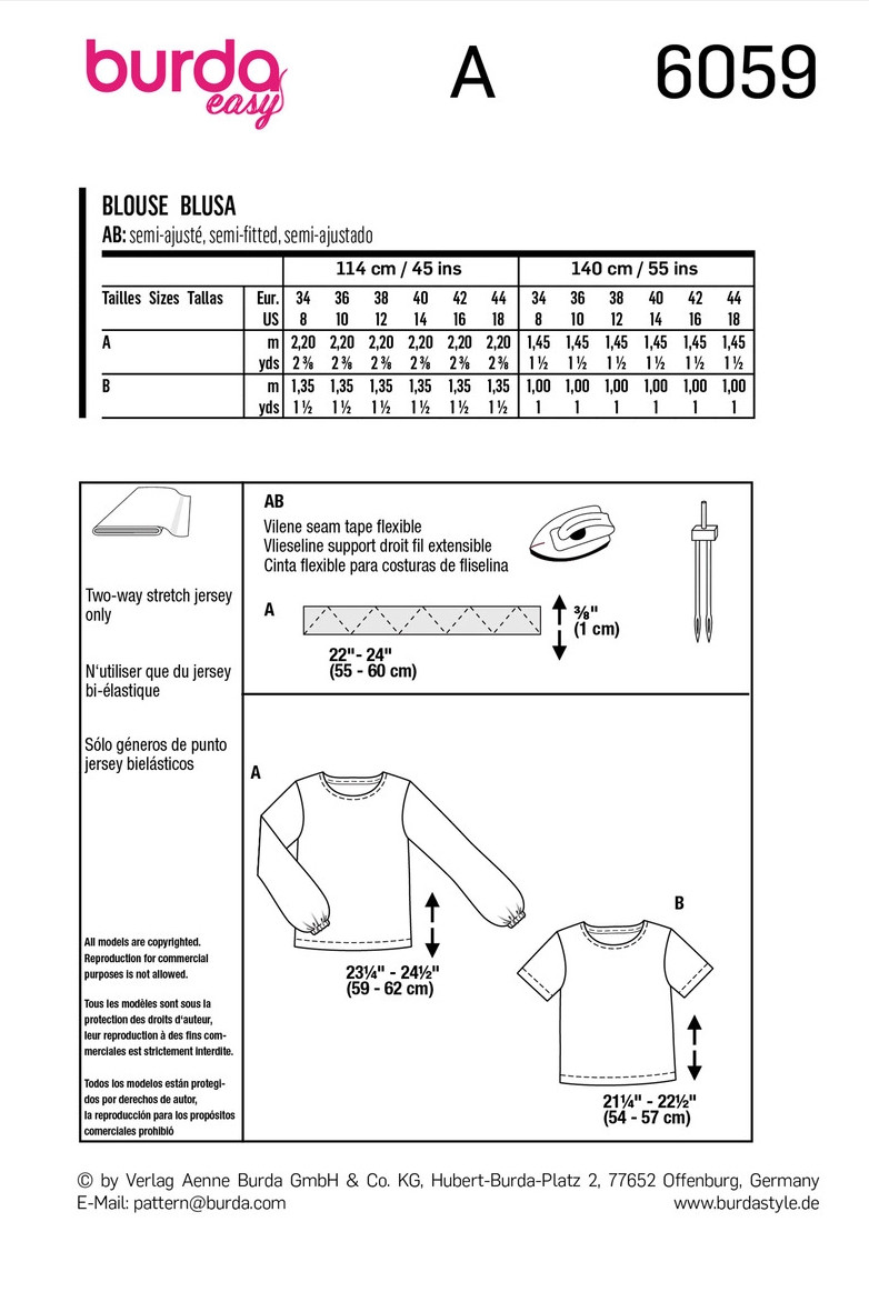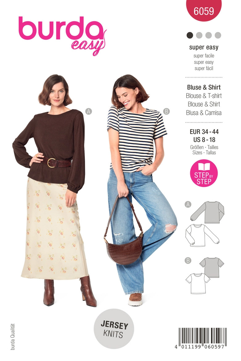 Casual tops and blouses of jersey fabric are so quick and easy to sew - you'll want to treat yourself to both! View A has long sleeves and elastic gathering at the lower edge. The classic short-sleeved top view B is a perennial favourite in any fabric, be it plain, striped or otherwise patterned.