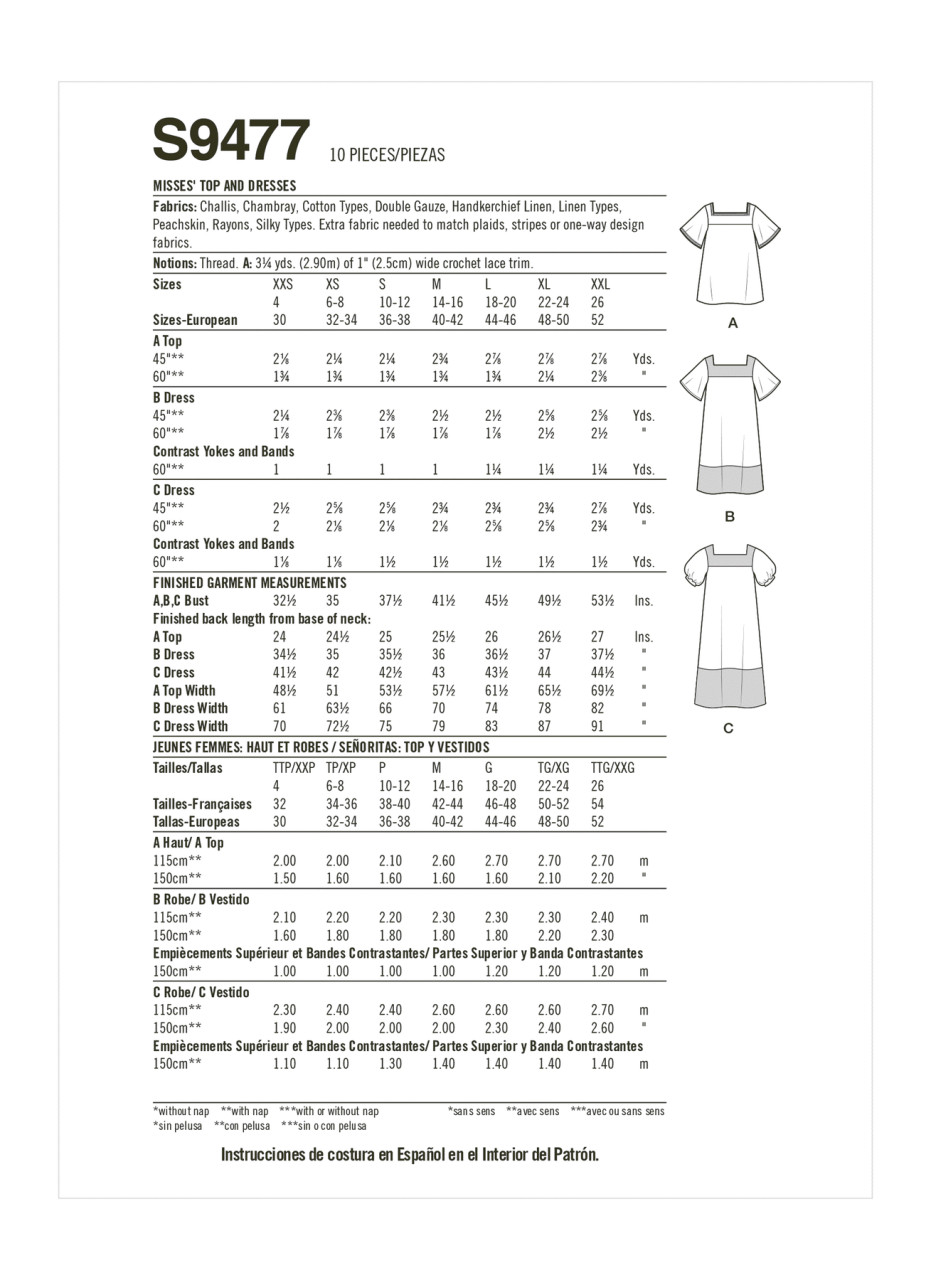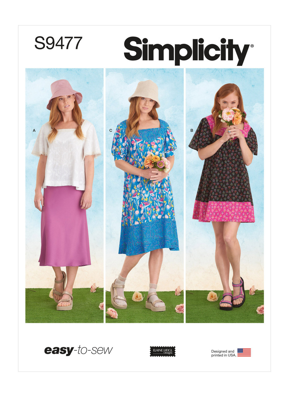 Easy pullover top and dresses have outside-applied front and back yokes, short sleeves and comfy A-line shape. Hip length top has flared sleeves and lace trim. Knee length dress has flared sleeves, contrast yokes and hem bands. Mid-calf length dress has puffed sleeves gathered to bands, contrast yokes and hem bands. Play with fabrics for a quirky look that's all your own!