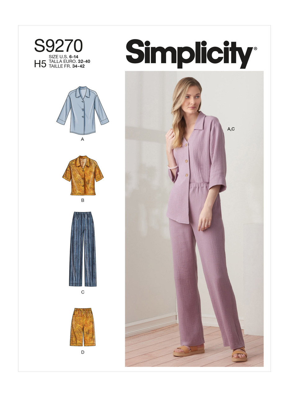 Misses' v-neck button up tops with pointed collar, long or short sleeves, shaped or straight hem; pull-on pants or shorts.
