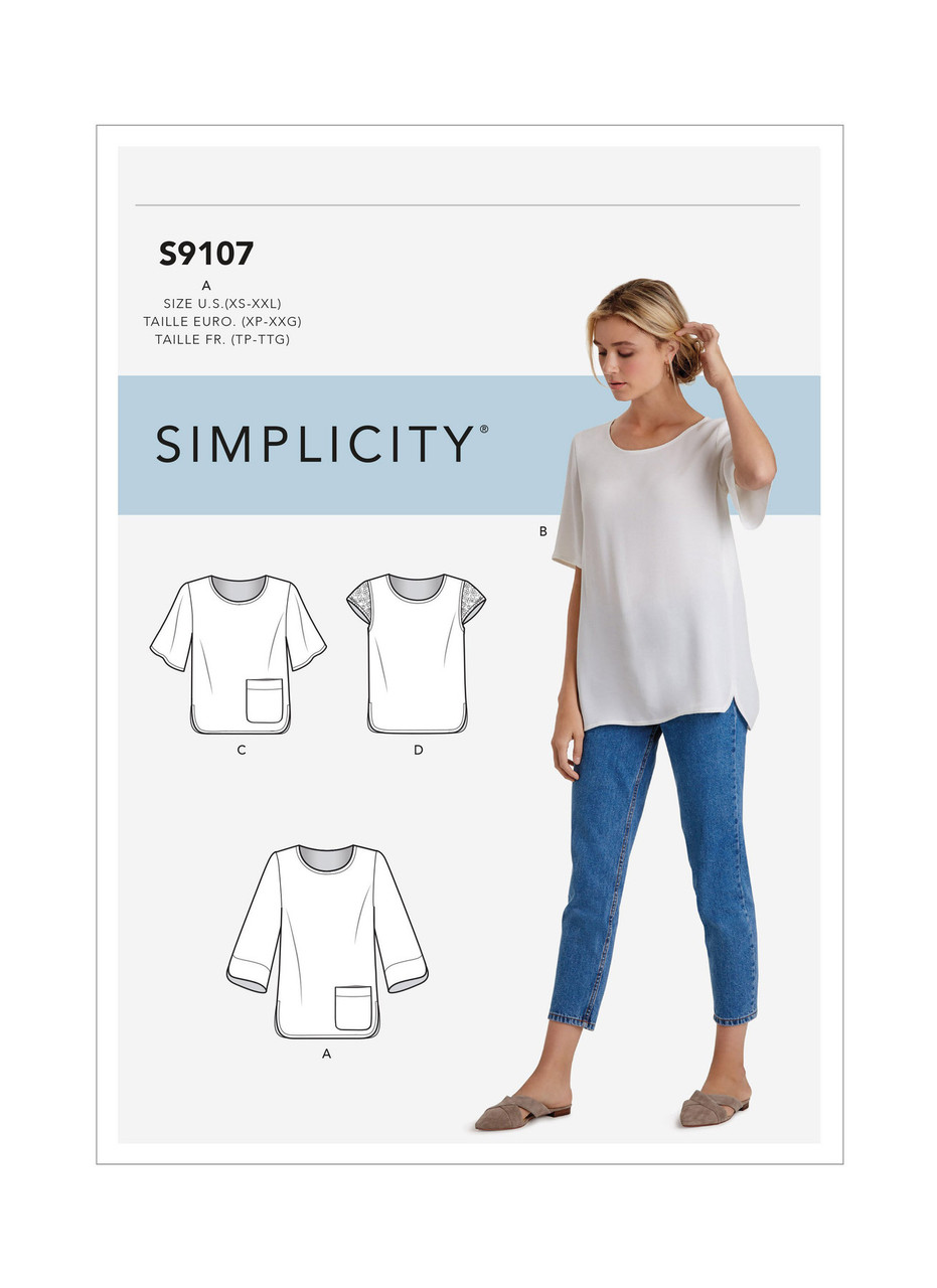 Misses' tops with sleeve and hem variations, back yoke with pleated back. A:, C: patch pocket.