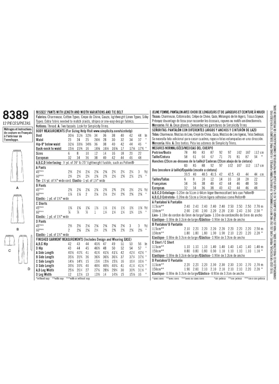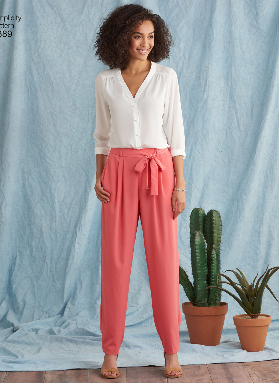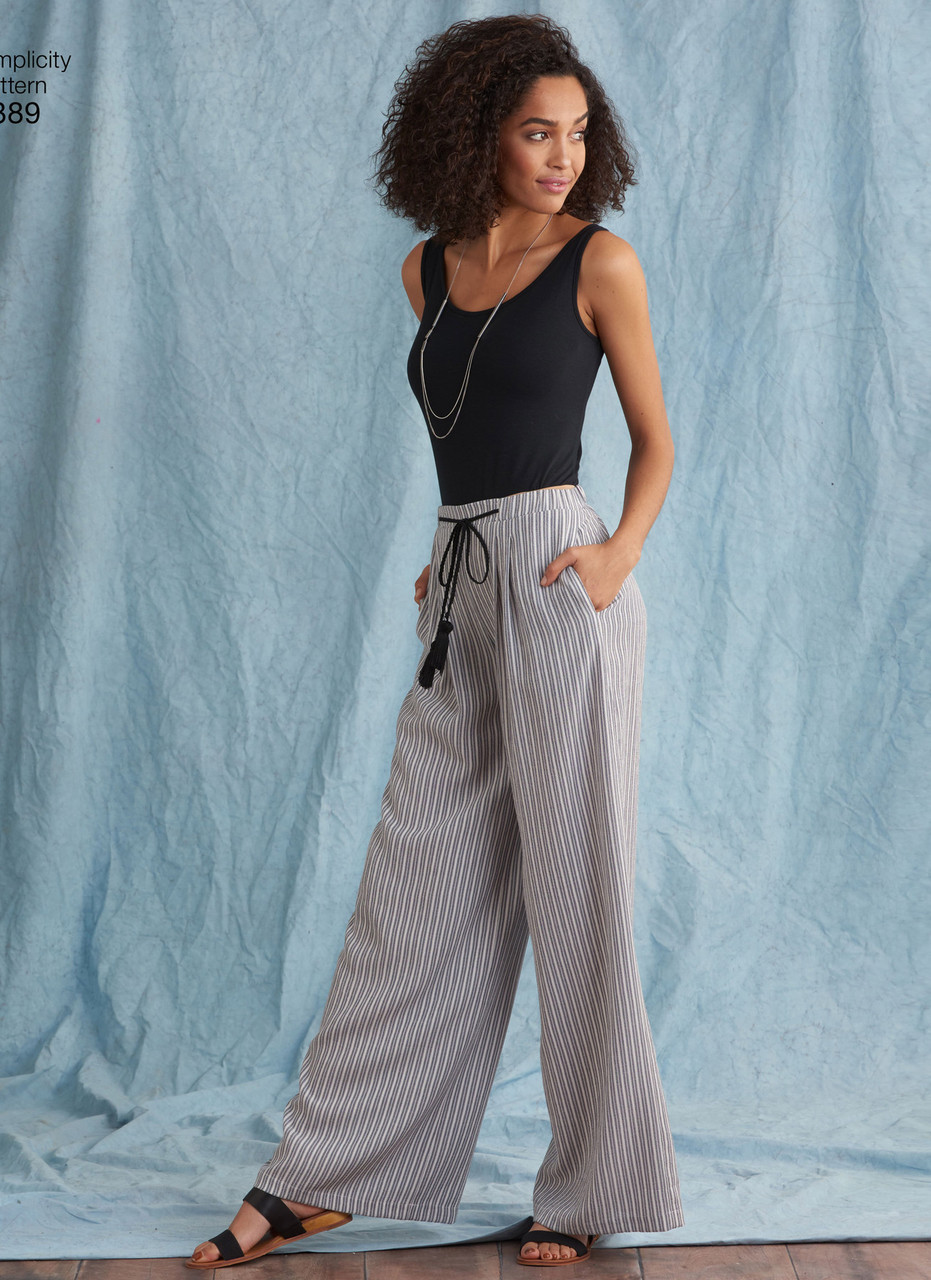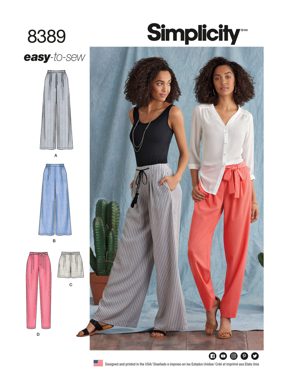 Easy to sew Women trousers with length variations are roomier at the top making them the perfect trousersto add to your summer wardrobe now. Pattern includes long trousers with a wide or narrow leg, a cropped wide leg pant, and shorts. All views have an elasticized waistband ending at the hip bone and finished off with a flat panel at front where you can add your choice of drawstring cord, tassels or a fabric tie belt. Simplicity Sewing Pattern.