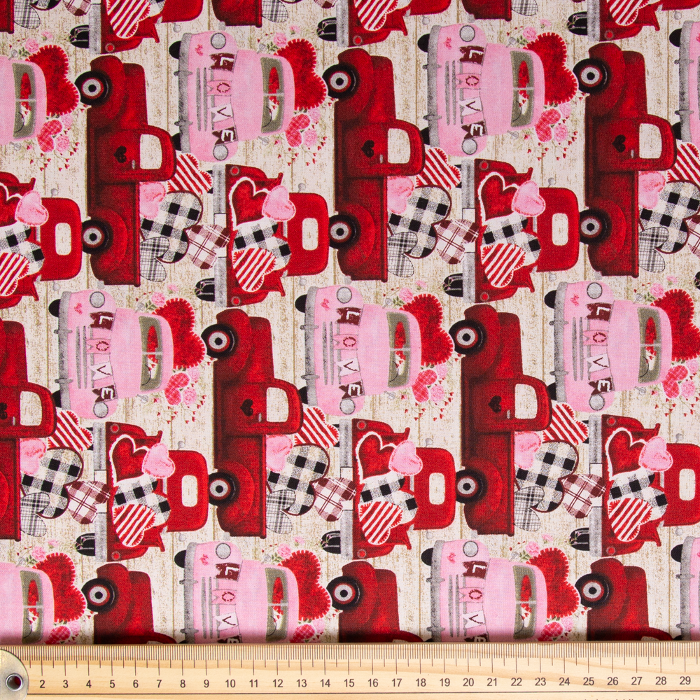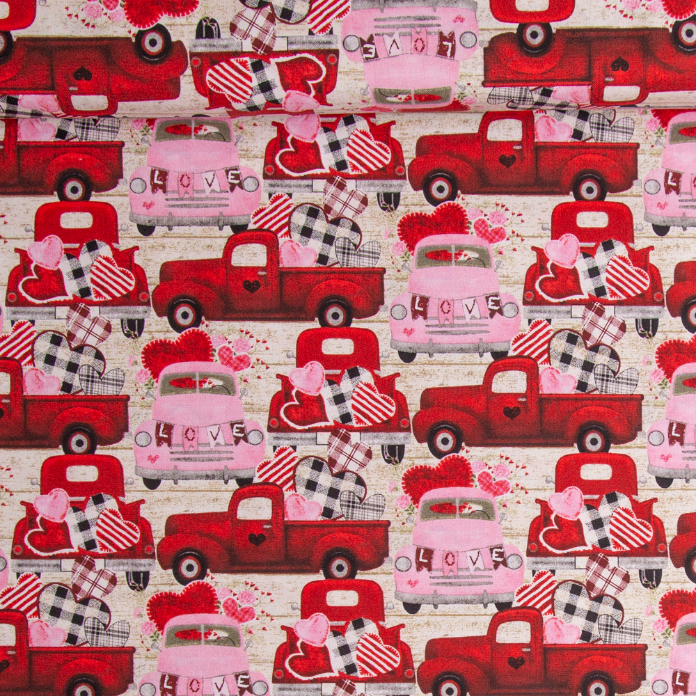 Wedding/love-themed automobile print in tones of pink and red. Beautiful, high quality, printed cotton fabric. Ideal for quilting, masks, crafts, displays, table decoration and as a dressmaking fabric.