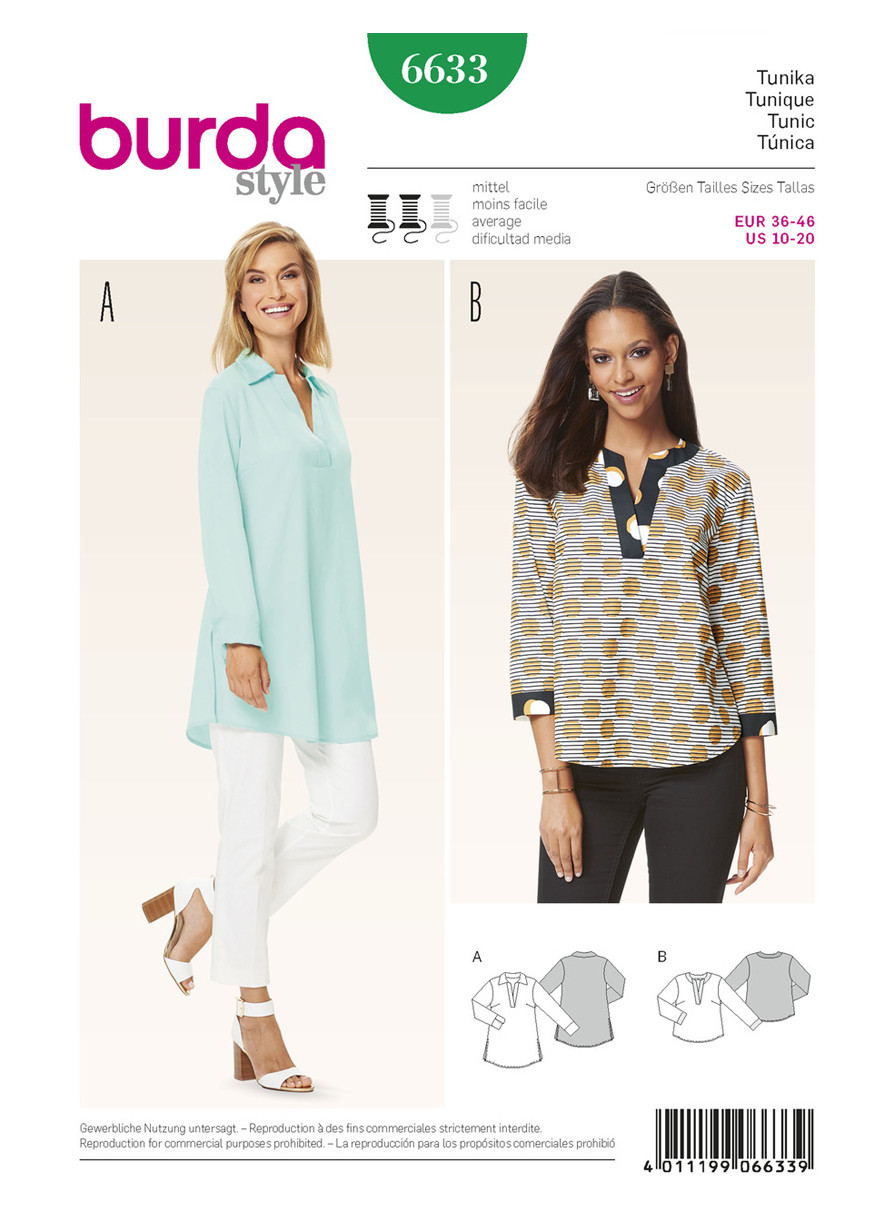 Tunic tops with decorative details have long been a fashion favorite. The angled polo fastening of this style can be combined with either a collar or round neckline. Mix pretty colors or fabrics for an extra portion of creativity.