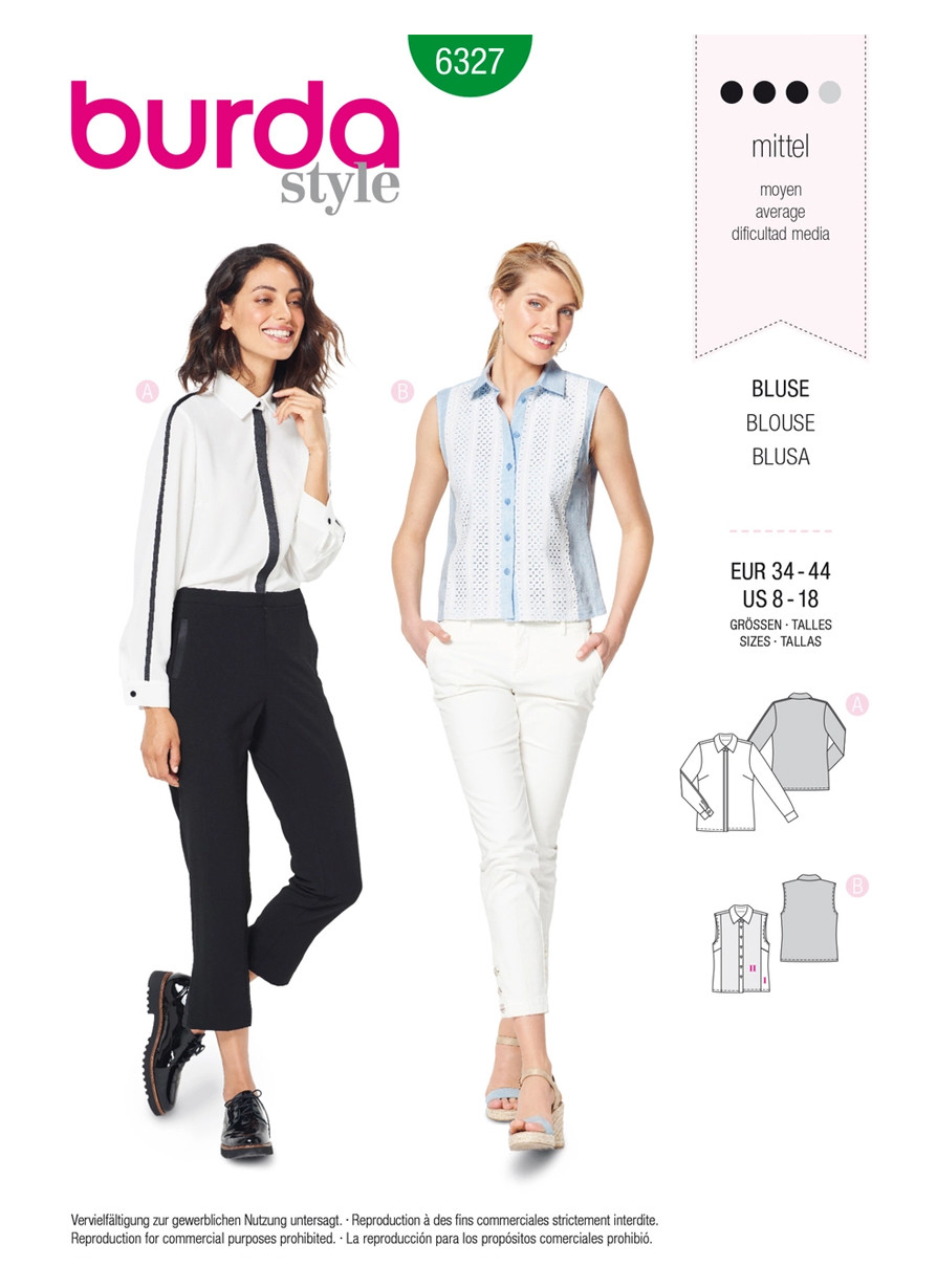 Blouses in shirt blouse style. The long cuffed sleeves and concealed button fastening of view A makes it a perfect partner for the office. Ribbons lend an extra stylish touch. Lace inserts adorn the front of sleeveless view B.