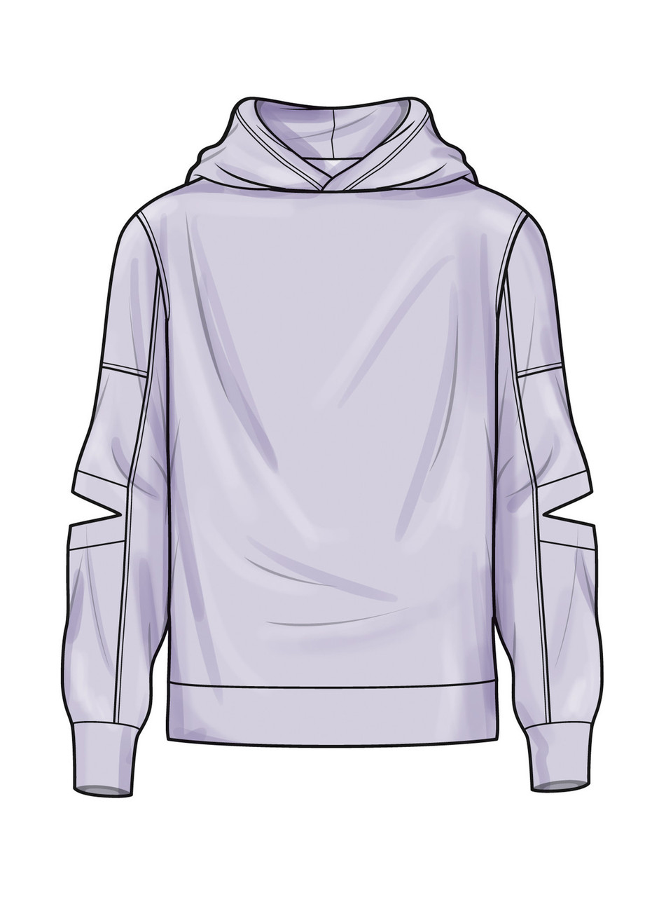Create these easy to sew oversized knit hoodies for Men and Misses. Hoodies come in short or long sleeves and have seam details. View B has sleeve bands, hem band, and slits at the elbow.