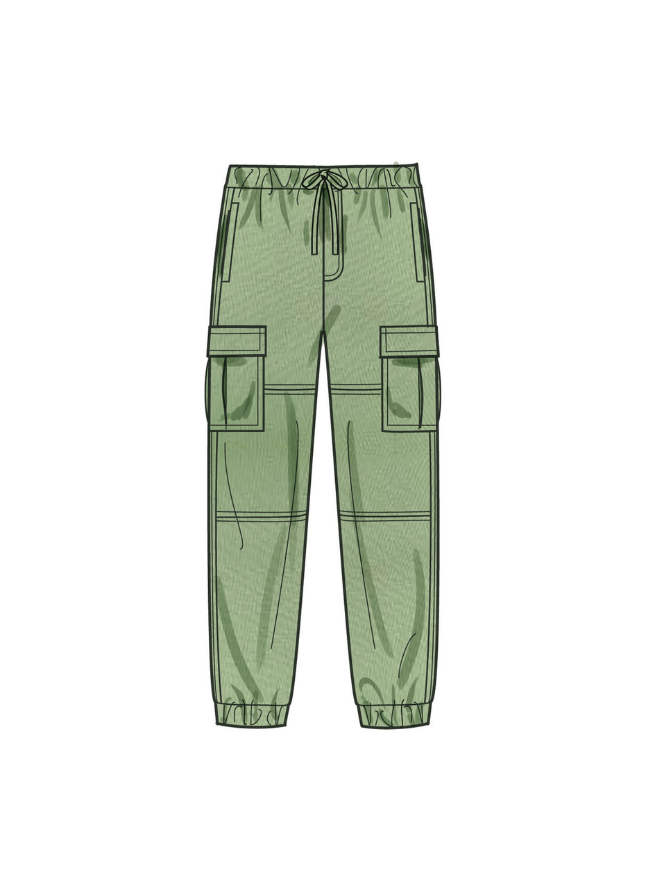 Shirt has separate collar and band, dropped shoulder, long sleeves with cuff and shaped patch chest pockets. Pull on cargo style pants have elastic at ankle and waistband plus drawstring, faux fly front, side seam pockets and cargo pockets that staddle the side seams.