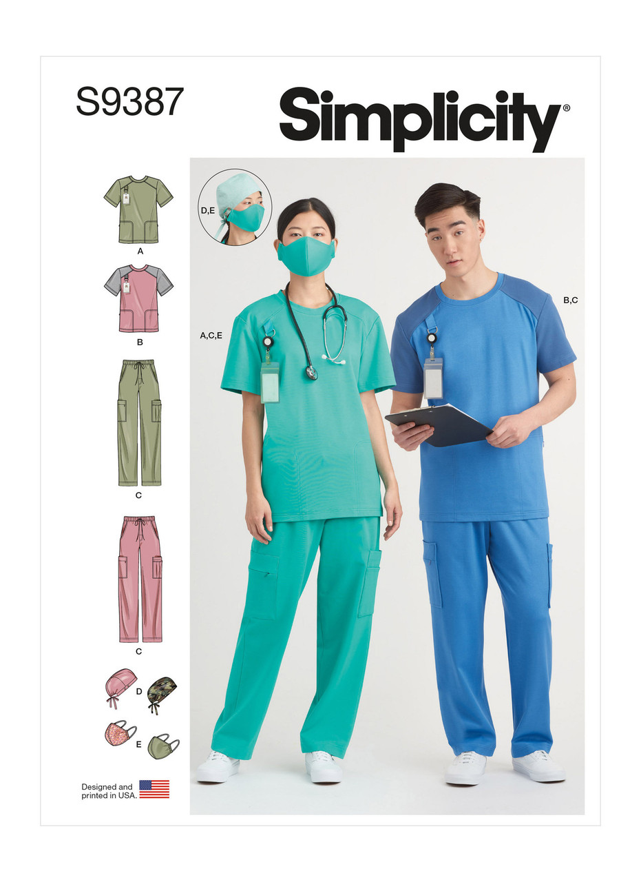 Scrub tops have round neckline, shoulder yoke, zippered pockets, badge holder; one view offers contrast fabric layout. Pull-on pants are straight leg with pocket details; mask and cap included.