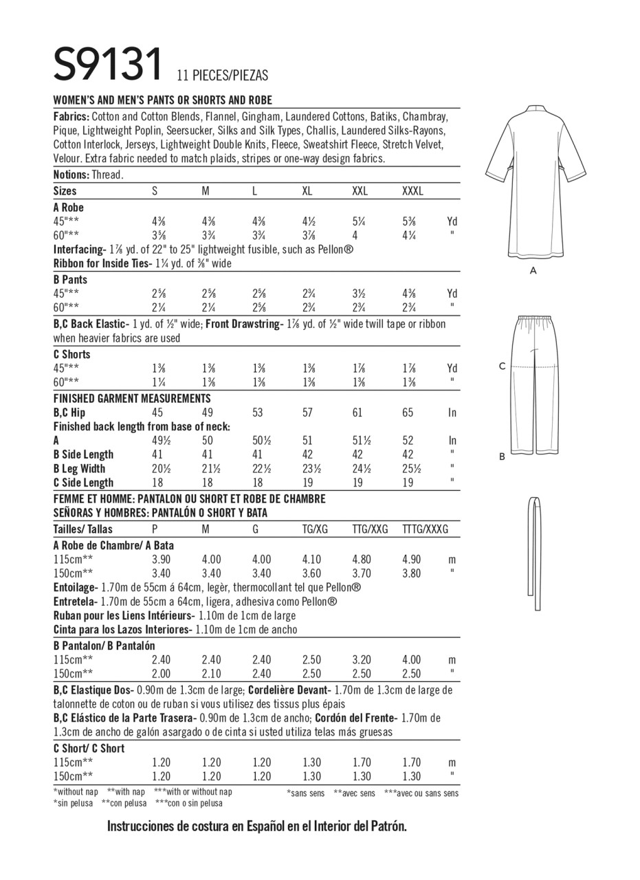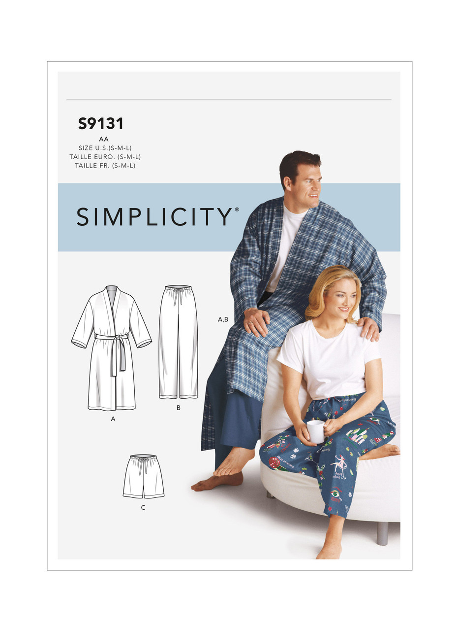 Simplicity sewing pattern for Women's and Men's Plus Size lounge pants or shorts and robe.