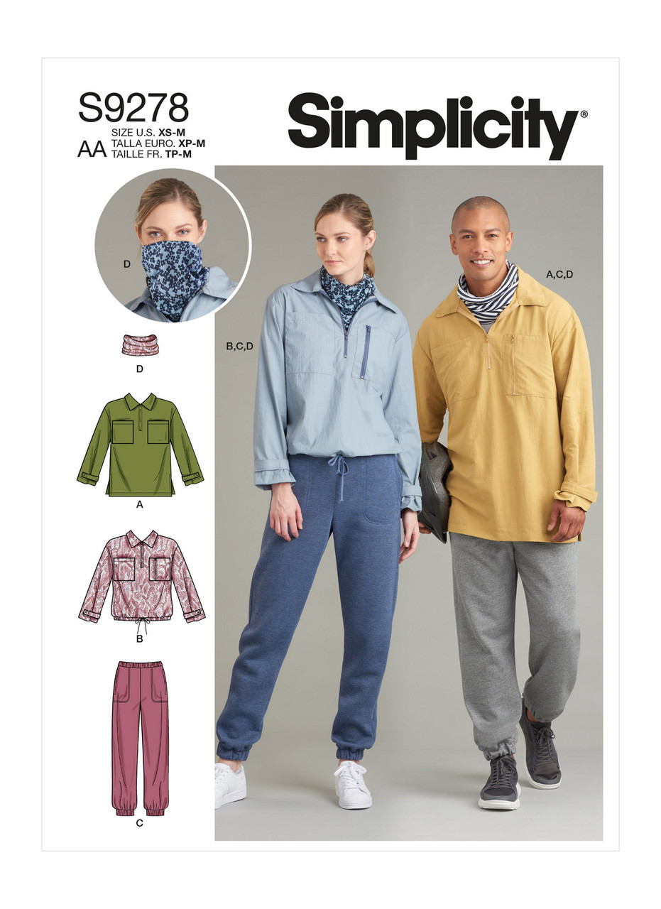 Unisex half zip top in two lengths has front & back utility pockets; slim pull-on pants & knit neckpiece.