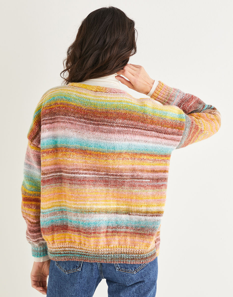 With a super flattering v neckline and relaxed shape, our cardigan in Sirdar Jewelspun features tortoise shell effect button fastening and is machine washable - perfect for when you're in a hurry. The colour effect of Sirdar Jewelspun adds stunning striped by nature tones adds a twist to an essential layering piece.