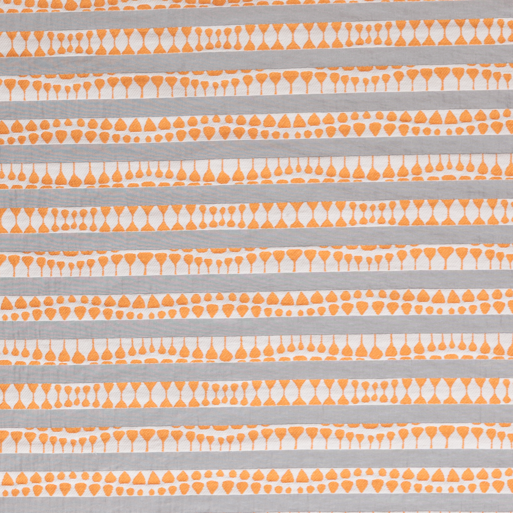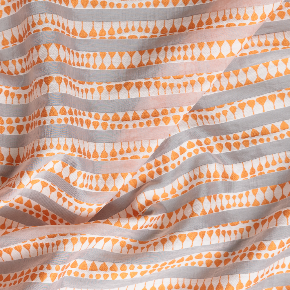 Step into retro glamour with a twist of global flair in this Vertical Stripe Ethnic Print Organza. Translucent and structural, this midweight organza features vivid orange vertical stripes layered with abstract triangle motifs -creating an eye-catching interplay of geometry and colour. With no stretch and a crisp hand, it’s made for full-skirted 1950s cocktail dresses, voluminous blouses, or avant-garde overlays. Whether you're channeling vintage silhouettes or crafting runway-ready drama, this fabric holds its shape and commands attention. A lining is recommended to enhance the depth of its semi-sheer nature.