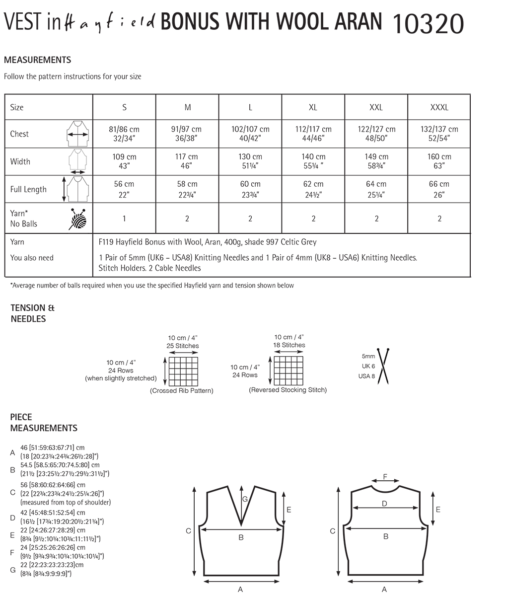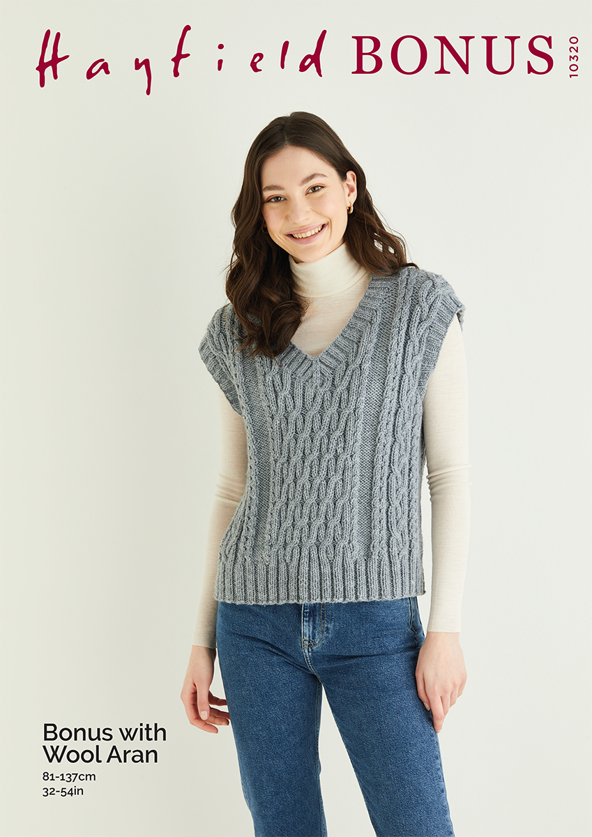 A neat, V neck vest is the season's must have knit. This one from out Feminine Aran collection has cabled panels which seem to grow directly from the rib. A lovely knit for more advanced knitters to show off your knitting skills, and your sleeves.