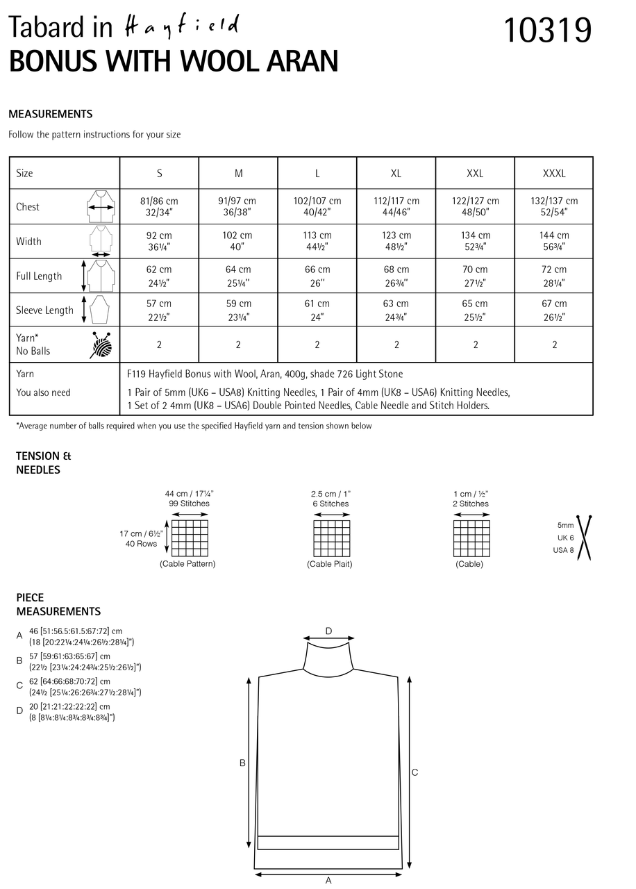 1 Pair of 5mm (UK6 – USA8) Knitting Needles, 1 Pair of 4mm (UK8 – USA6) Knitting Needles, 1 Set of 2 4mm (UK8 – USA6) Double Pointed Needles, Cable Needle and Stitch Holders.
