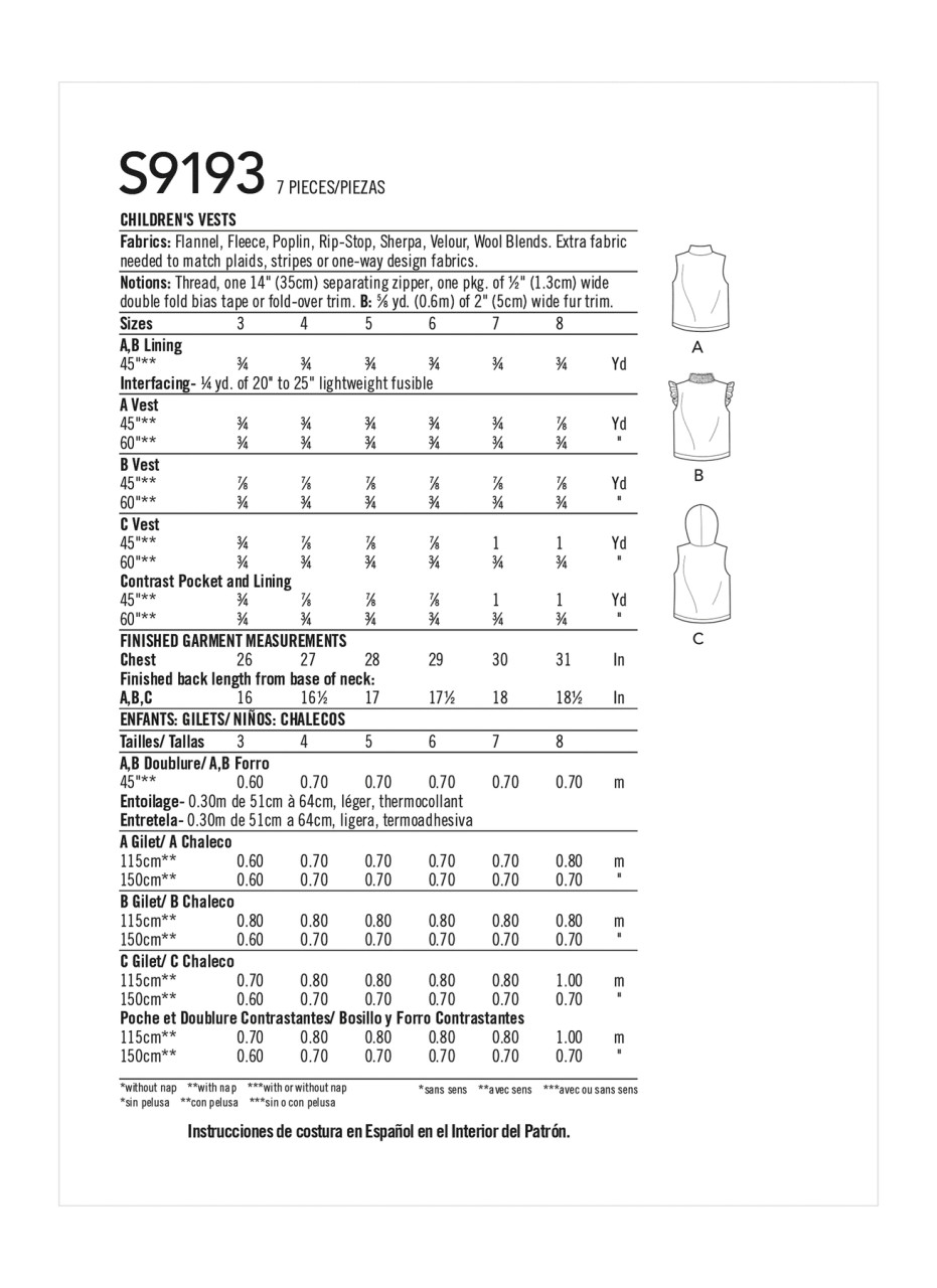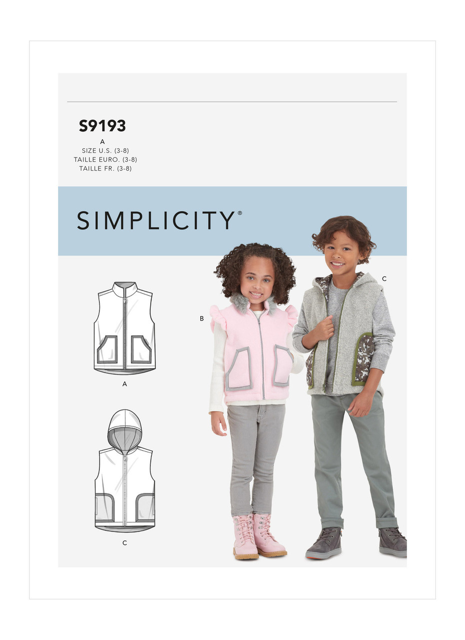 Children's zip front vests with collar or hood variations are lined with fashion fabric.