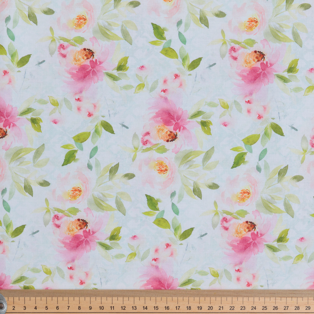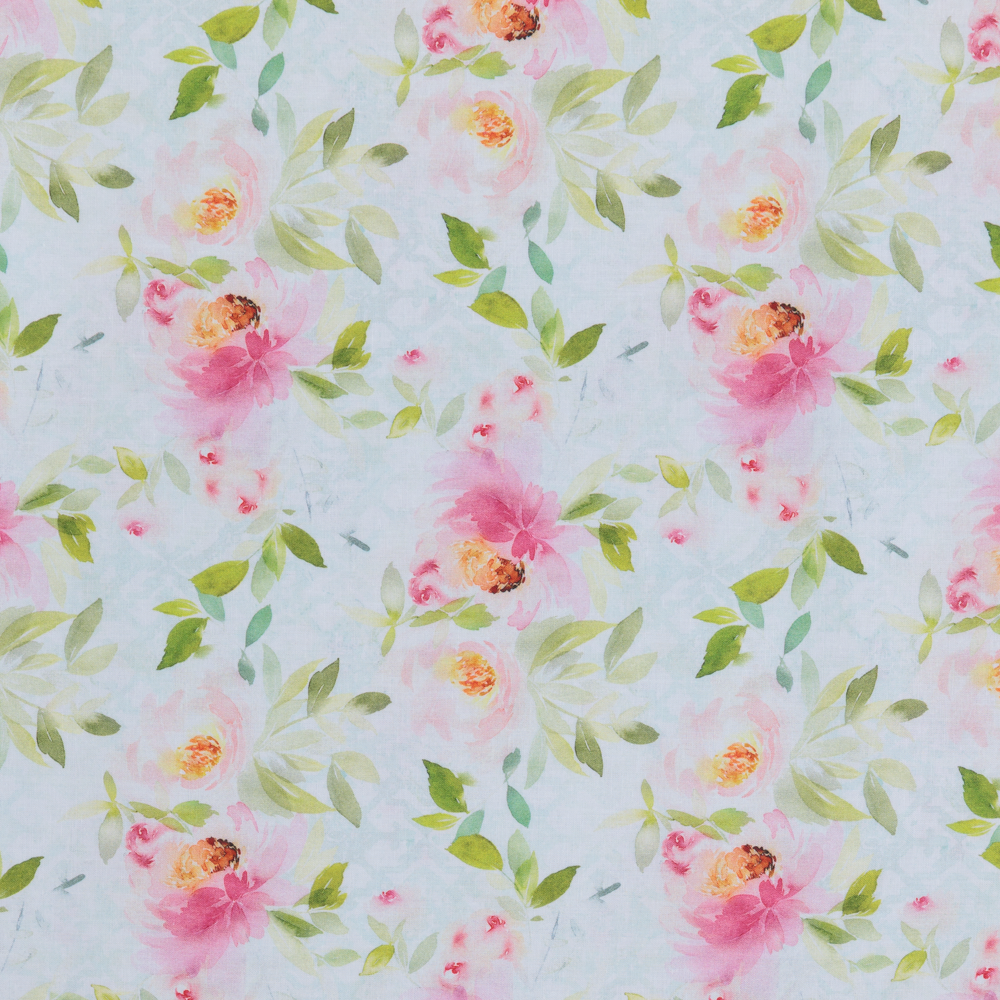 Vintage floral in soft pink and green tones on a light blue background. Beautiful, high quality, printed cotton fabric. Ideal for quilting, masks, crafts, displays, table decoration and as a dressmaking fabric.