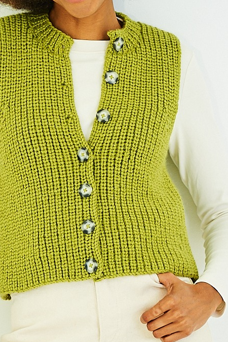 1 pair 5 mm (UK 6 – USA 8) knitting needles. Stitch holders. 7 buttons, 2.5cm, 1in for round neck waistcoat and 5 buttons, 2.5cm, 1in for v neck waistcoat.