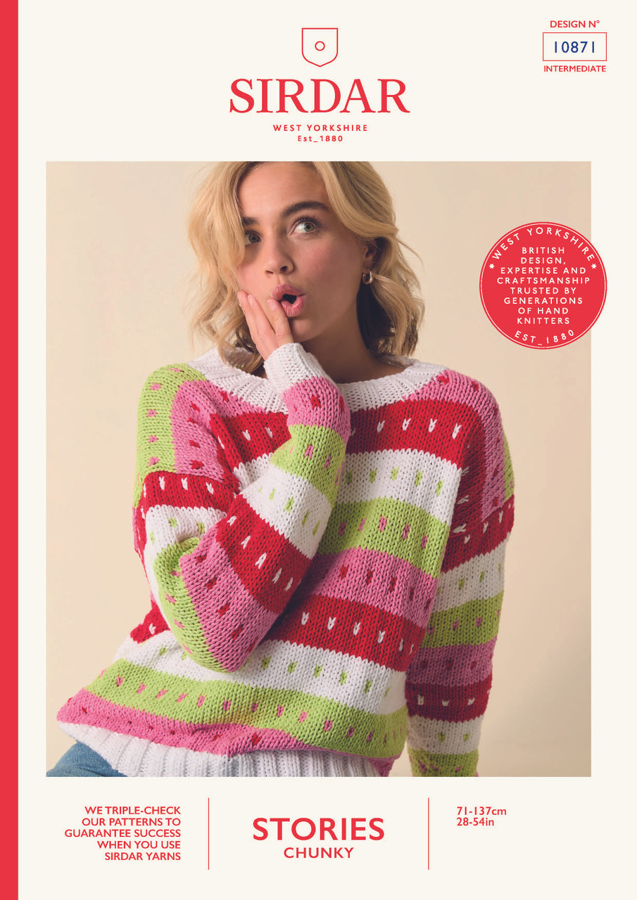 This sweater knitting pattern, with its chunky stripe and spot design, is the ideal introduction to Fair Isle knitting. Drop sleeves and a relaxed, boxy shape keep things simple so you can focus on your colour-changes in quick-knit Sirdar Stories Chunky.