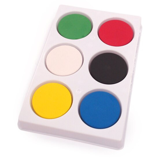 Sturdy plastic palette containing 6 watercolour blocks. Each block is 44mm in diameter, and 16mm thick. Colours include black, white, red, yellow, blue, green.