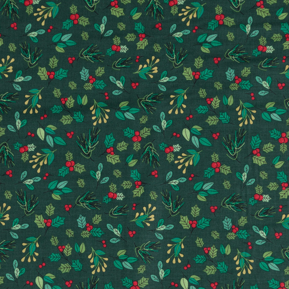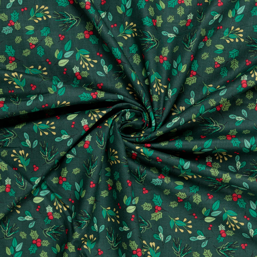 Traditional Nordic Winter leaves on dark green. Beautiful, high quality, printed cotton fabric. Ideal for quilting, masks, crafts, displays, table decoration and as a dressmaking fabric.