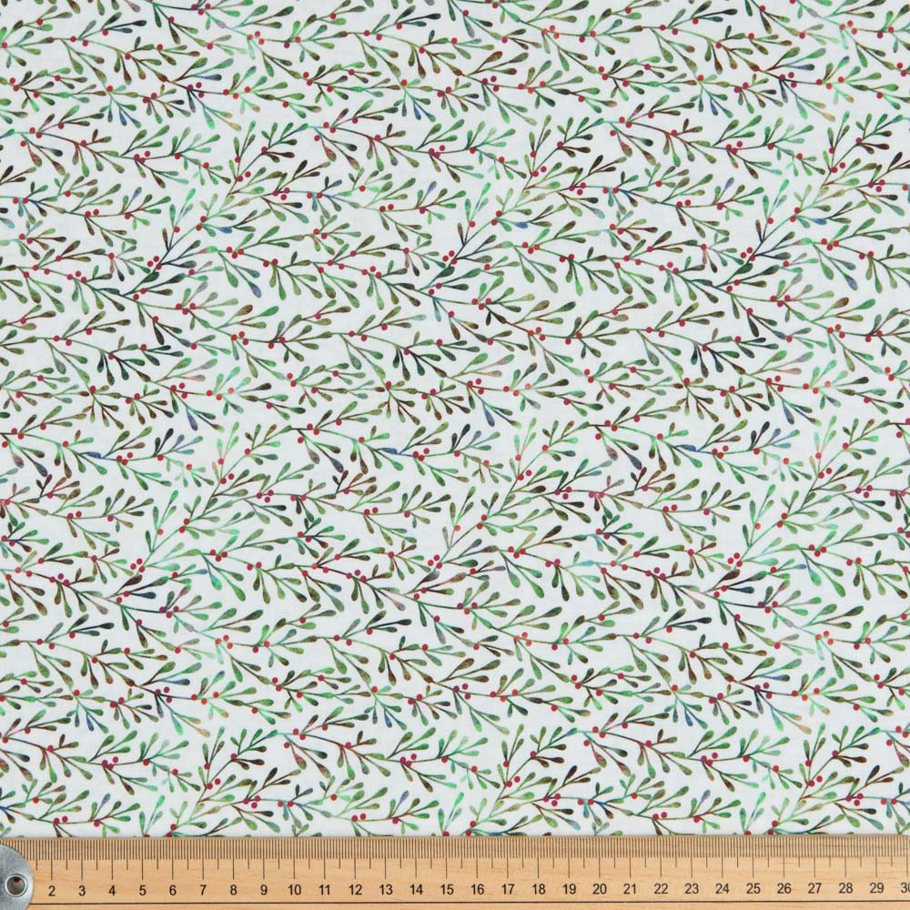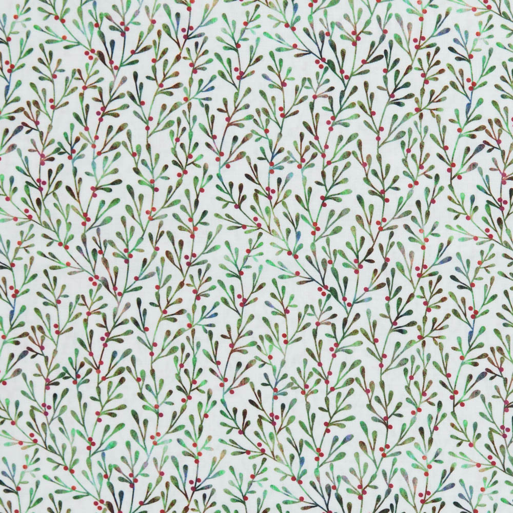 Mistletoe and red berry print on white. Beautiful, high quality, printed fabric. Ideal for quilting, masks, crafts, displays, table decoration and as a dressmaking fabric.