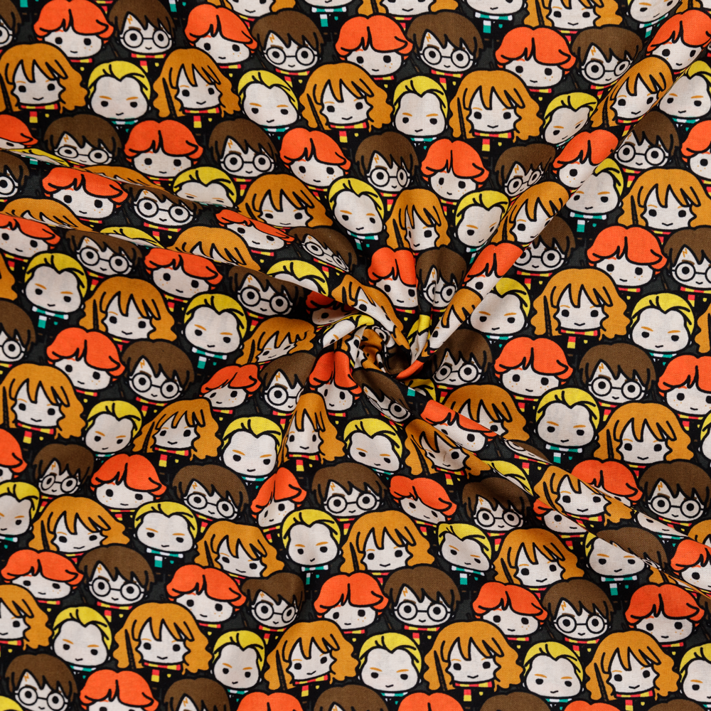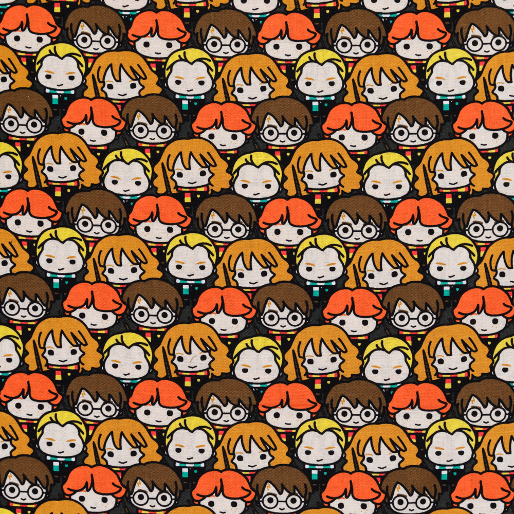 Kawaii Harry Potter characters create this stacked pattern on brown. Beautiful, high quality, printed cotton fabric. Ideal for quilting, masks, crafts, displays, table decoration and as a dressmaking fabric.
