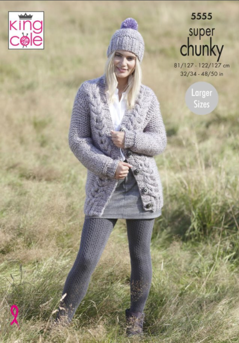 Ladies super chunky cabled cardigan with matching hat and scarf. This pattern quickly knits up with super chunky yarn. Perfect for winter.
