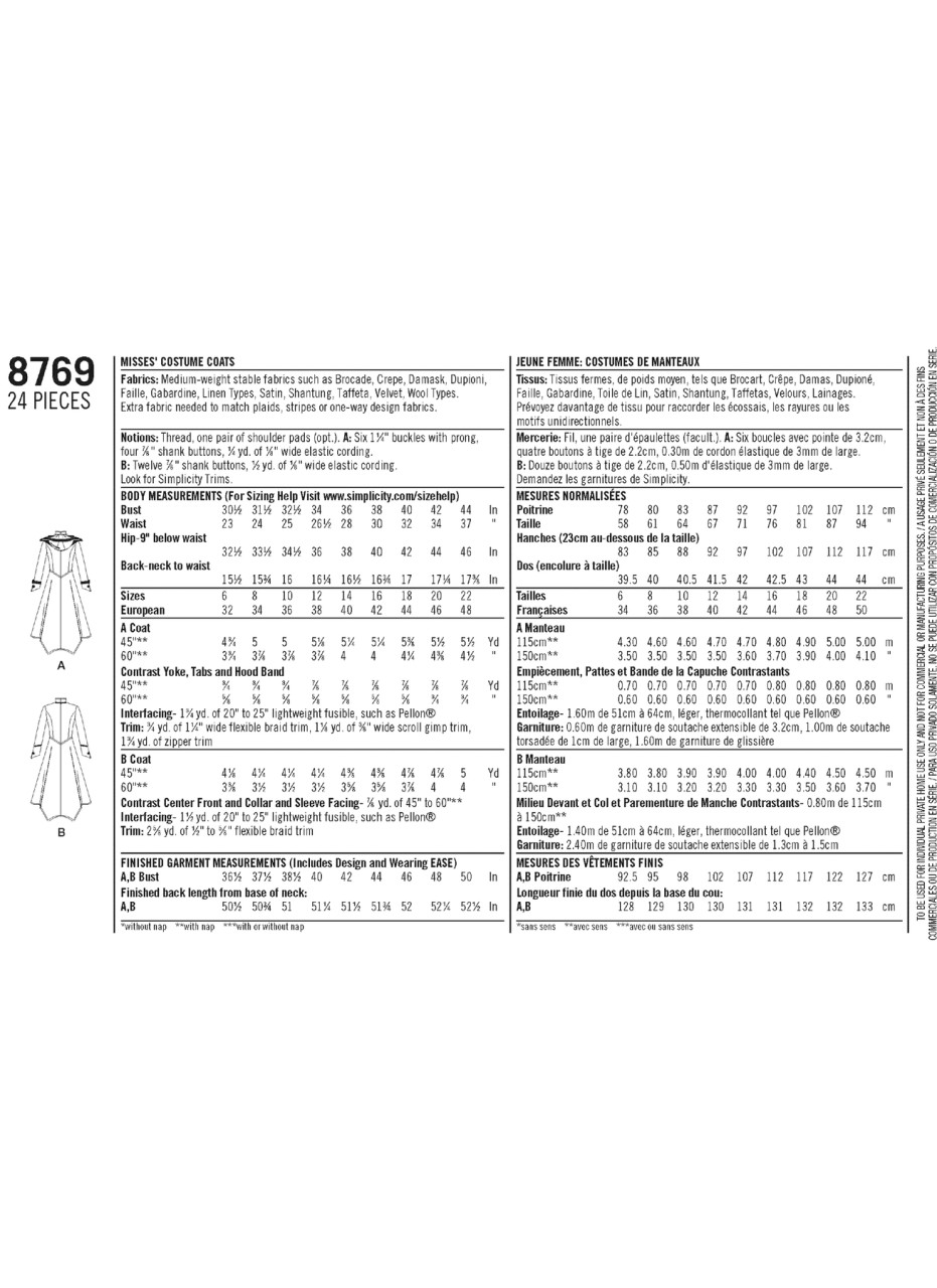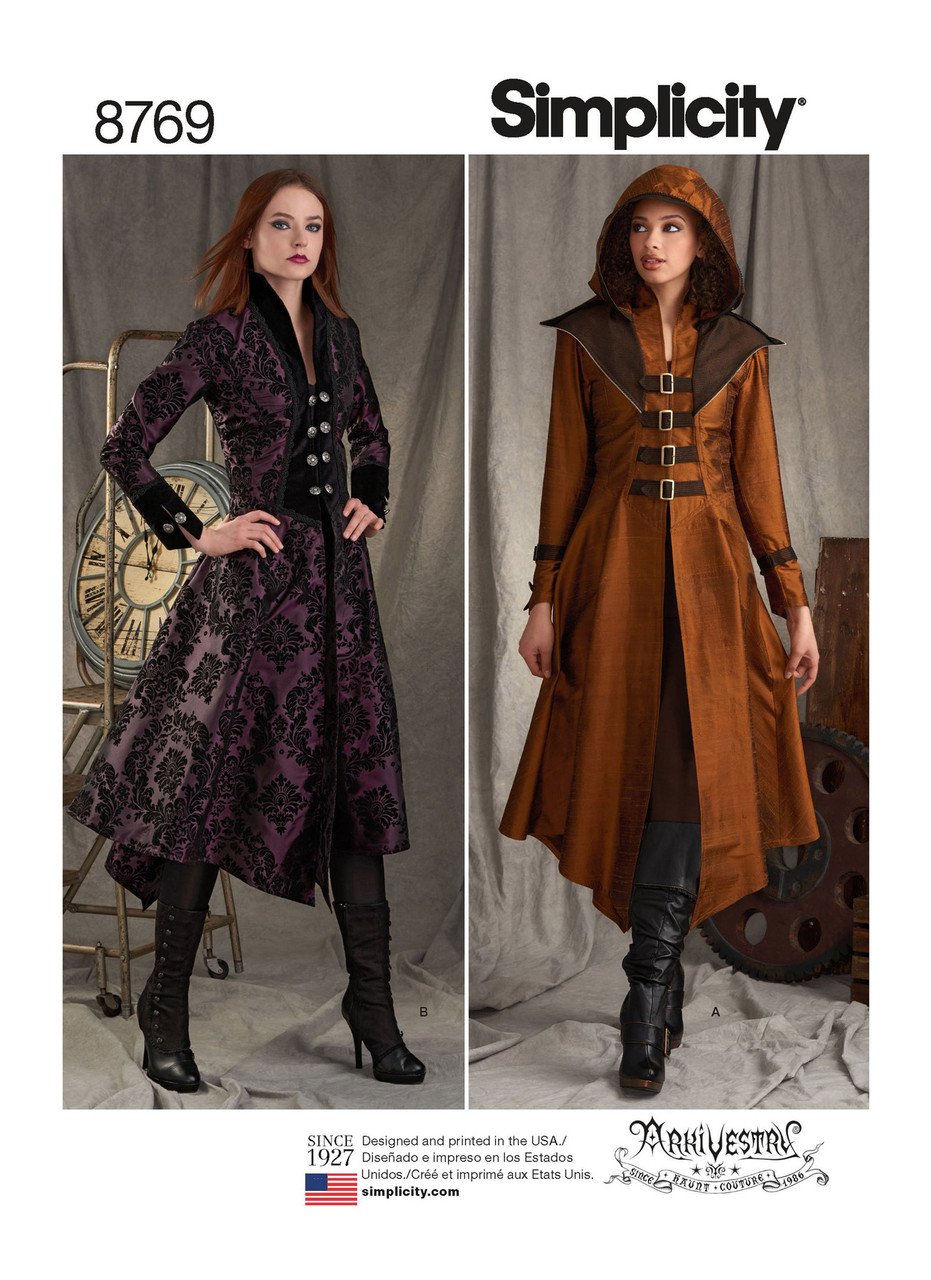 Arm yourself with a killer Military Cosplay coat with long pleats. View A includes hood, shoulder pads, and exposed buckles with prong. View B displays front buttons and trimming along the chest. Sleeves covering hands with small slits. Artivestry for Simplicity.