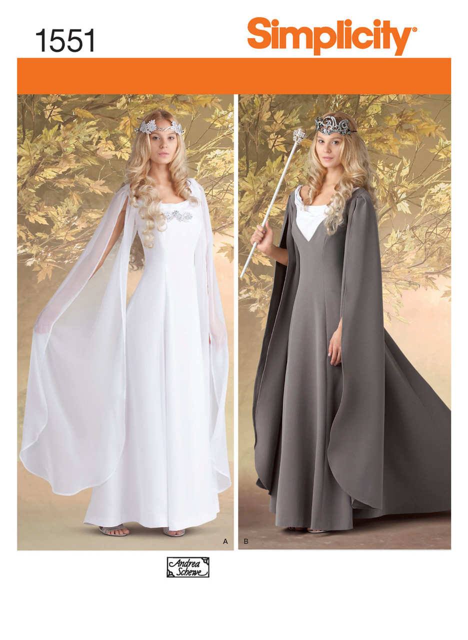 Women's costume gown with hanging sleeves, scoop neckline and collar variations. Andrea Schewe. Simplicity sewing pattern.