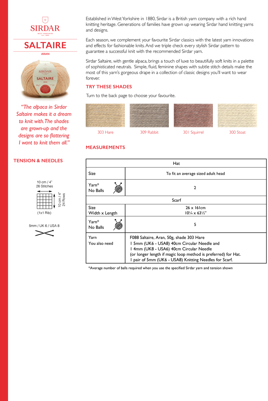 The alpaca in Sirdar Saltaire adds a luxurious softness to this hat and scarf set. Our timeless neutral palette means this set is bound to be one you reach for over and over again. A classic cold-weather essential.
