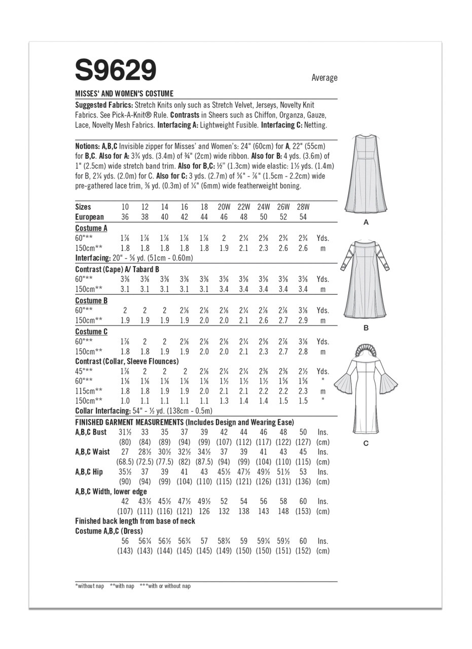 Full length knit costume gowns have back zippers and side slits. Choose sleeveless V-neck bodice with ribbon belt and sheer capes, or elasticized off-the-shoulder bodices with sleeves. Trimmed long sleeved gown is layered with a sheer tabard. Elbow length sleeved gown has trimmed sheer flounces and elasticized collar.
