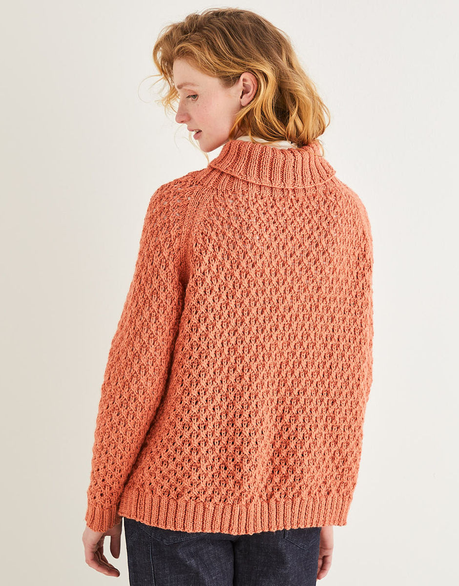 Our Sirdar Country Classic Worsted merino wool blend brings beautiful stitch definition to this textured, feather lace cardigan. Relaxed open-front styling with a deep rib shaped shawl collar and trim for added sophistication.