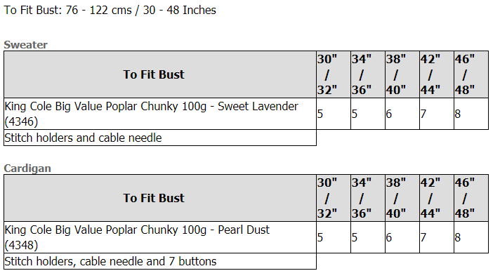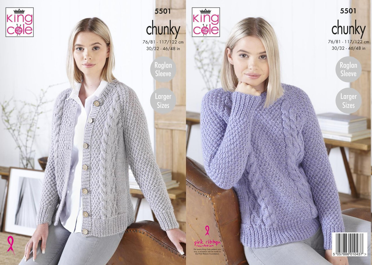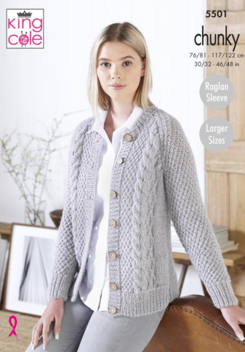 This chunky knitting pattern leaflet 5501 by King Cole will instruct you on how to create a lady's raglan sleeve textured sweater and cardigan with cable detail.