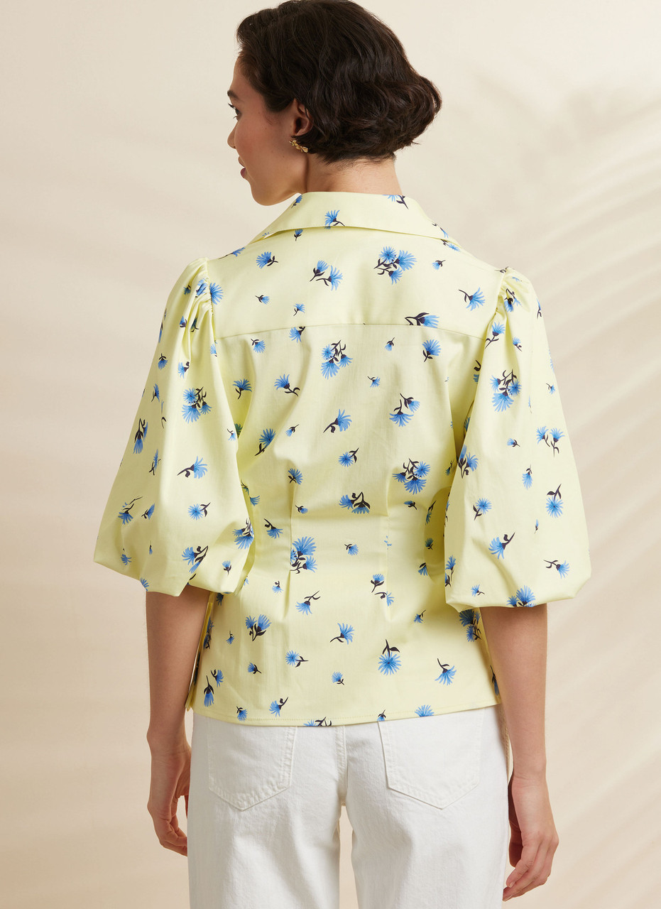 Wrap top, close-fitting through bust, has collar, side tie closure and inside ribbon ties. Views A and B have puff sleeves. View C has long bishop sleeves.
